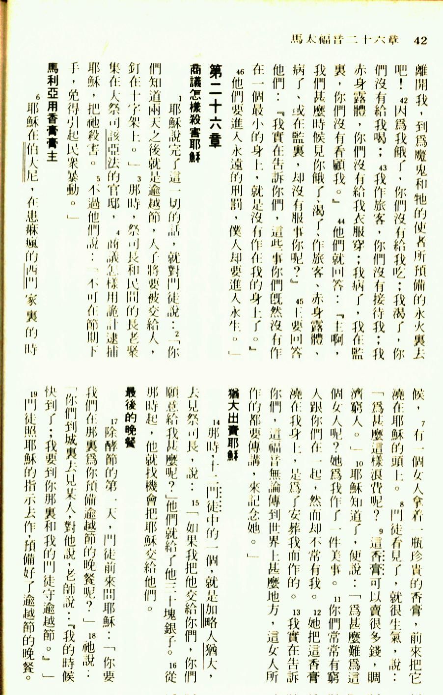 1976年圣经新译本新约 马太福音 25 章 42 节到 26 章 19 节