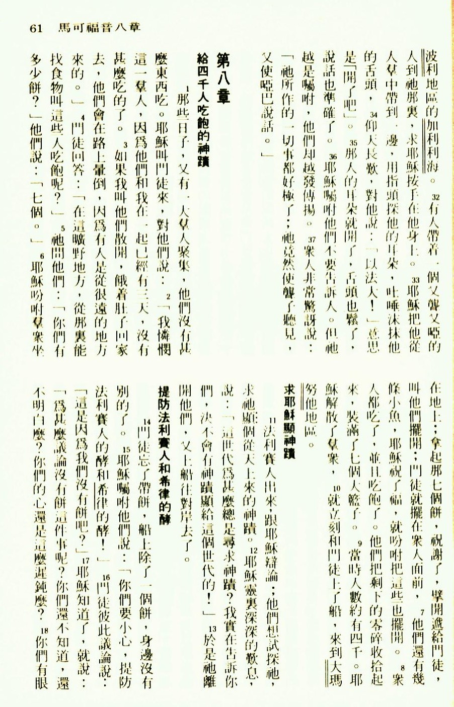 1976年圣经新译本新约 马可福音 7 章 32 节到 8 章 18 节