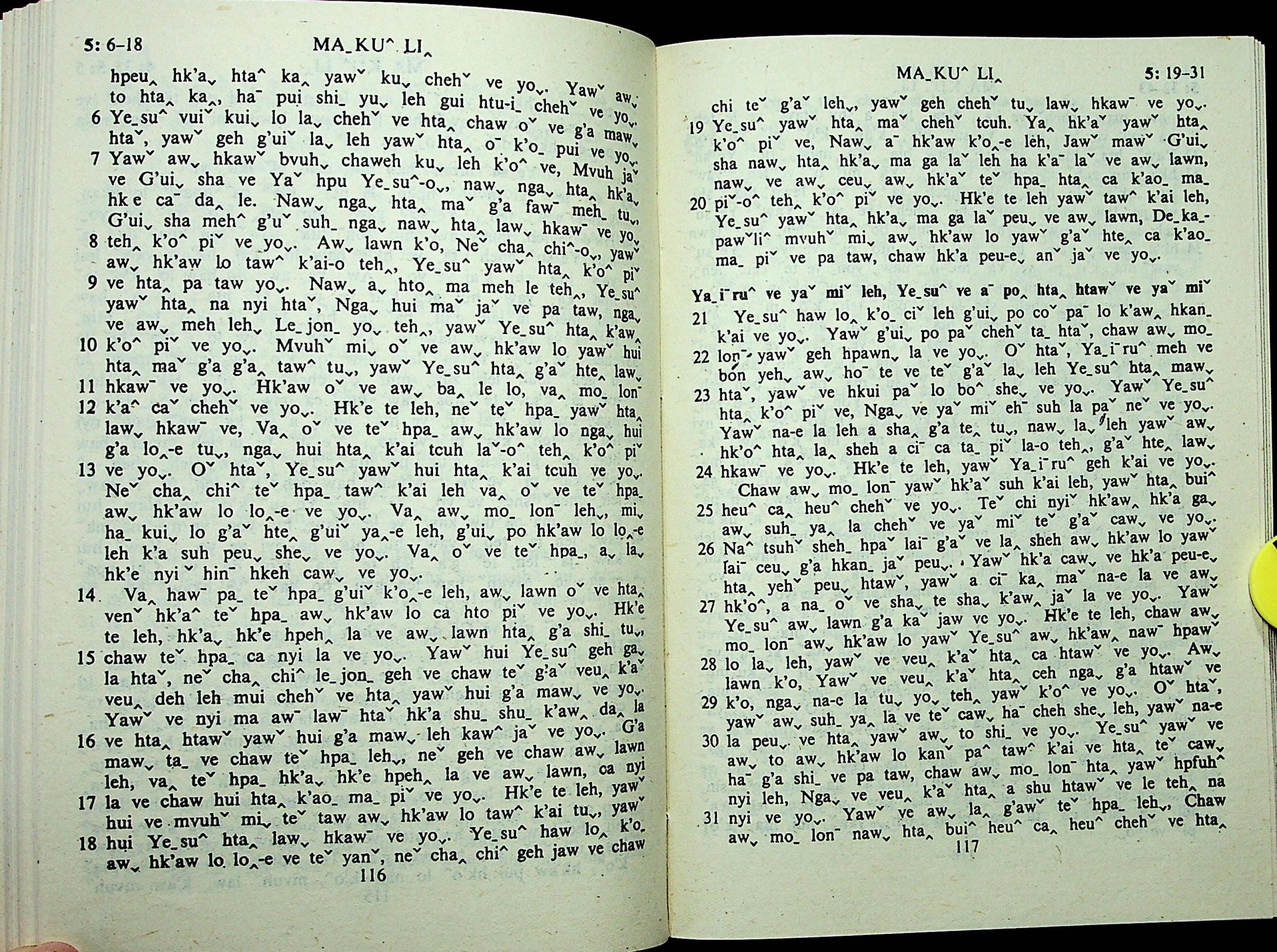1985年拉祜文新约全书 马可福音 5 章 6 节到 5 章 31 节