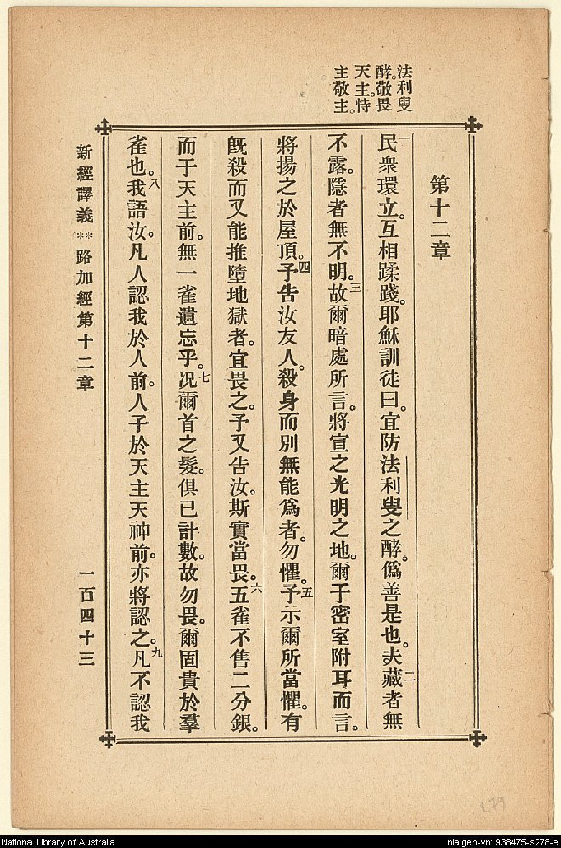 1907年新約四福音(新經譯義) 路加福音 12 章 1 節到 12 章 9 節