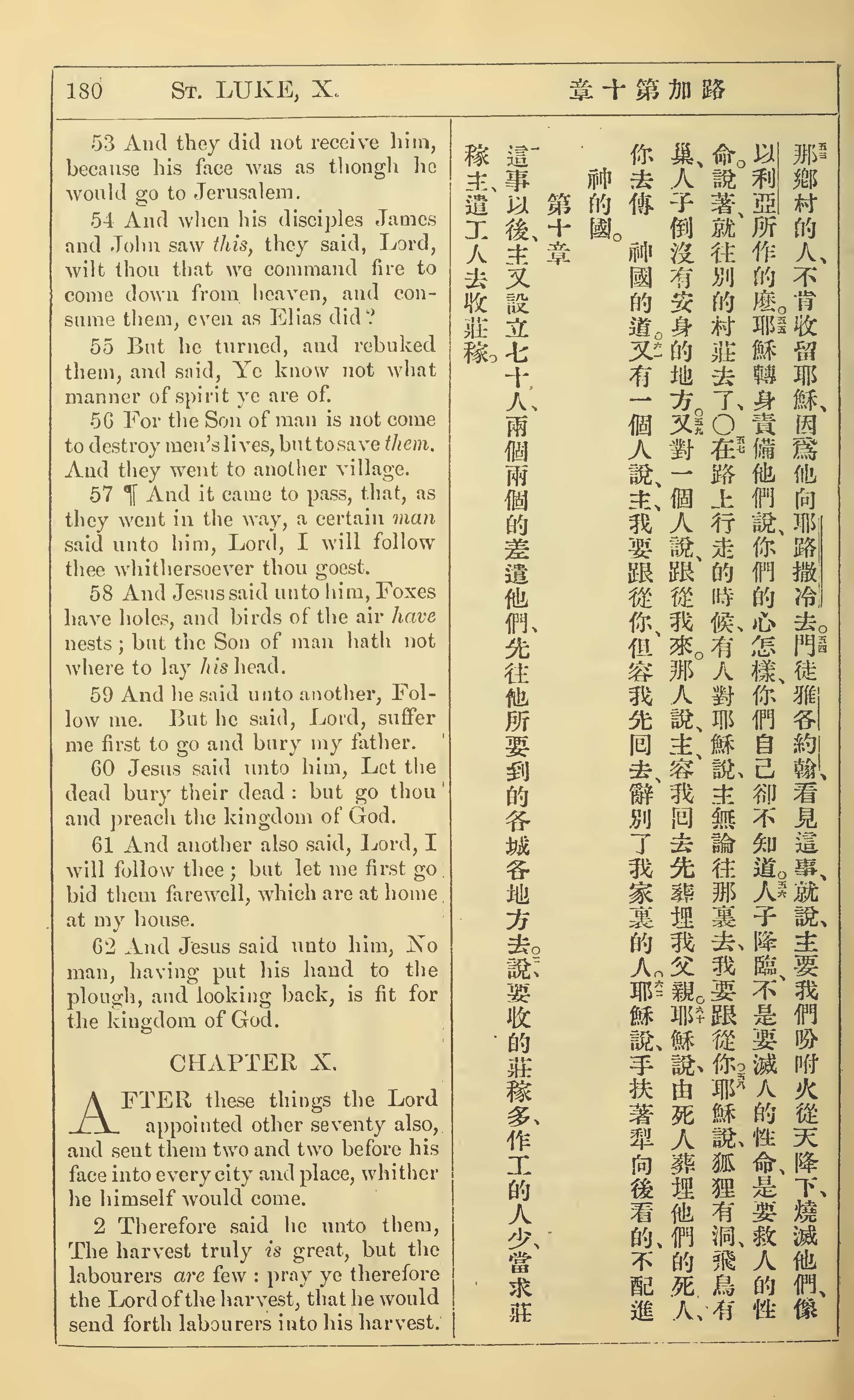1902年新約全書(中英對照) 路加福音 9 章 53 節到 10 章 2 節