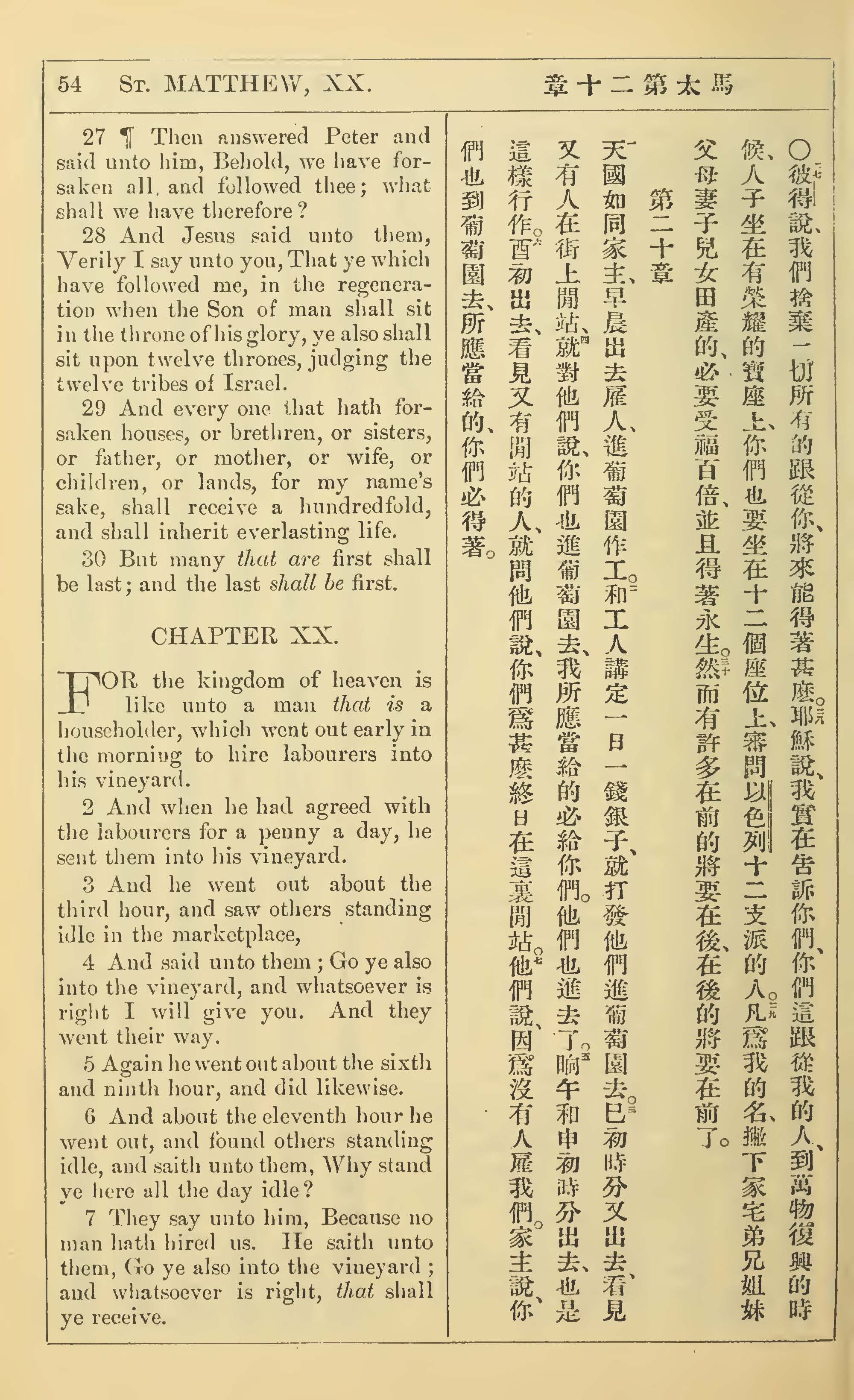 1902年新約全書(中英對照) 馬太福音 19 章 27 節到 20 章 7 節