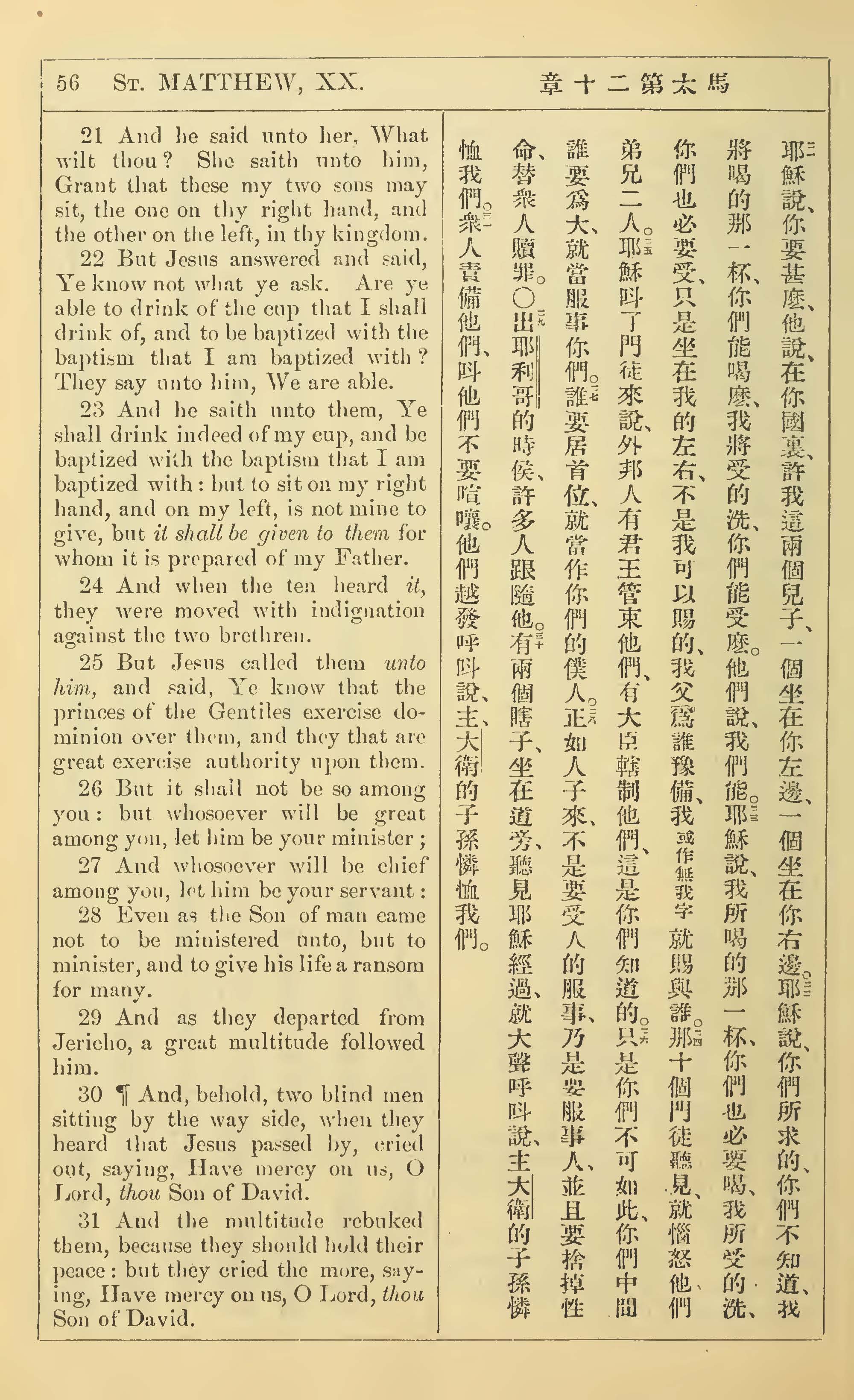 1902年新約全書(中英對照) 馬太福音 20 章 21 節到 20 章 31 節