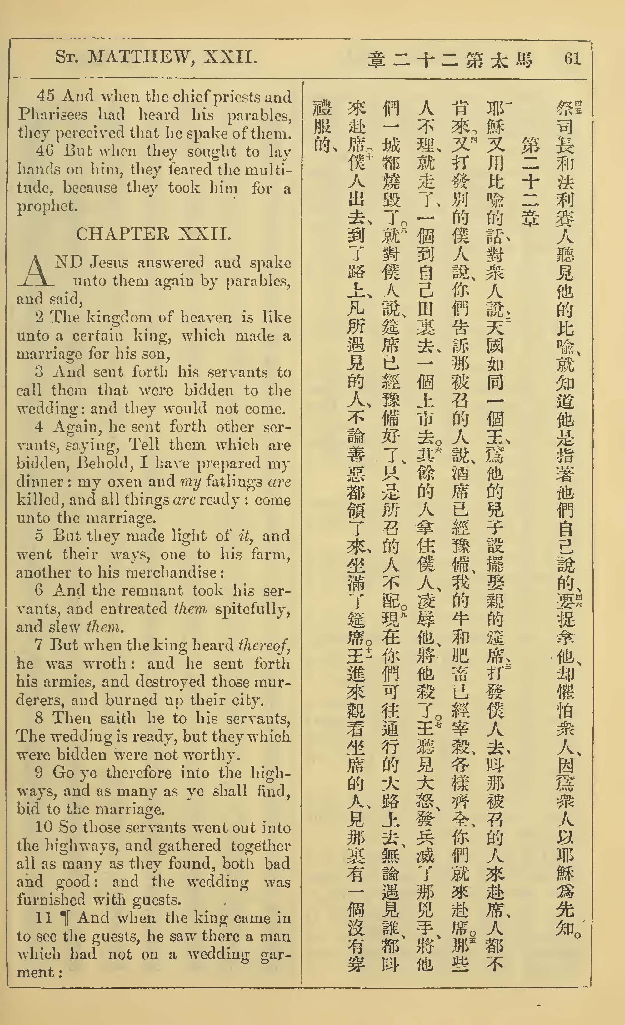 1902年新約全書(中英對照) 馬太福音 21 章 45 節到 22 章 11 節