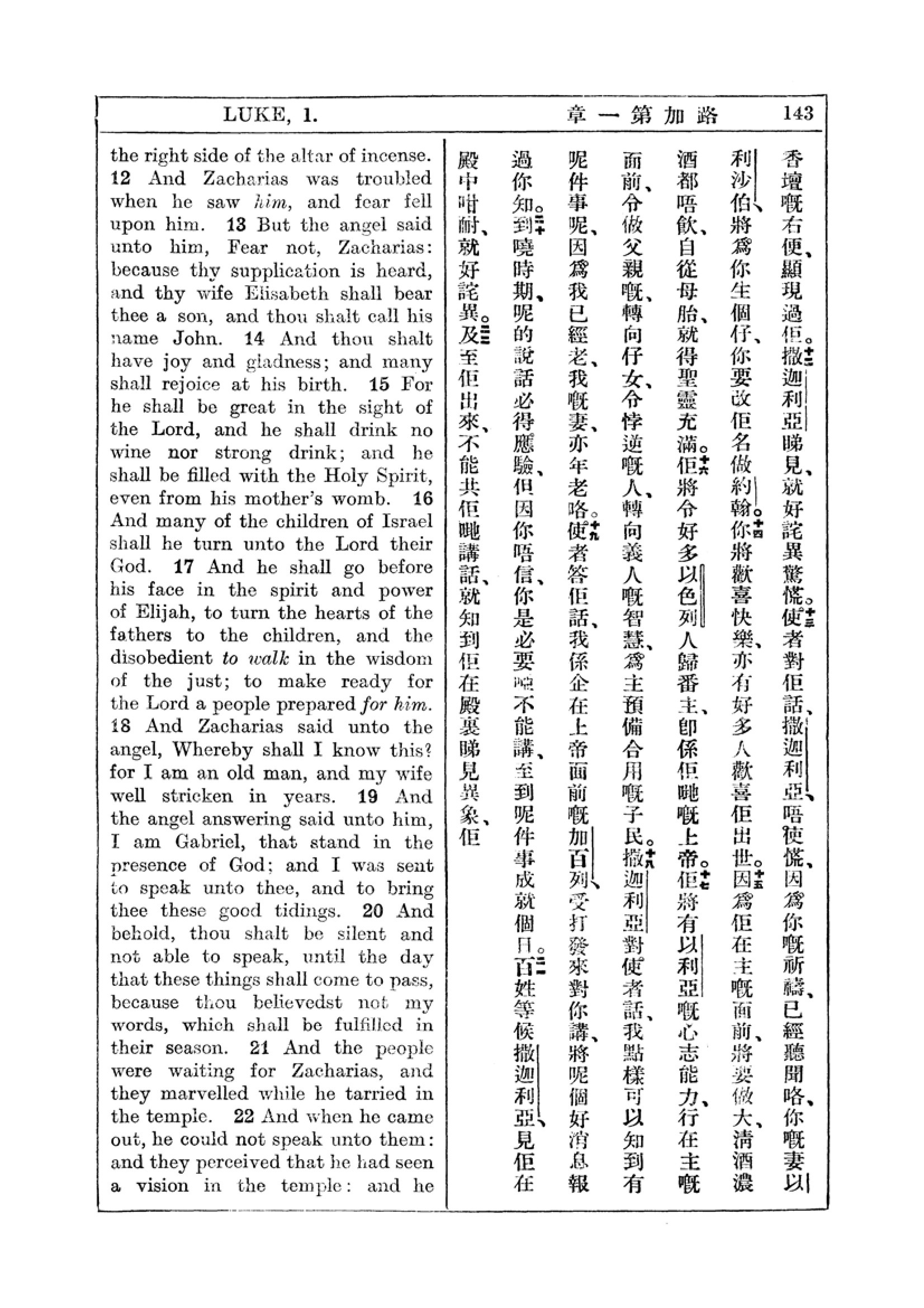 1927年新約全書(中英對照) 路加福音 1 章 12 節到 1 章 22 節