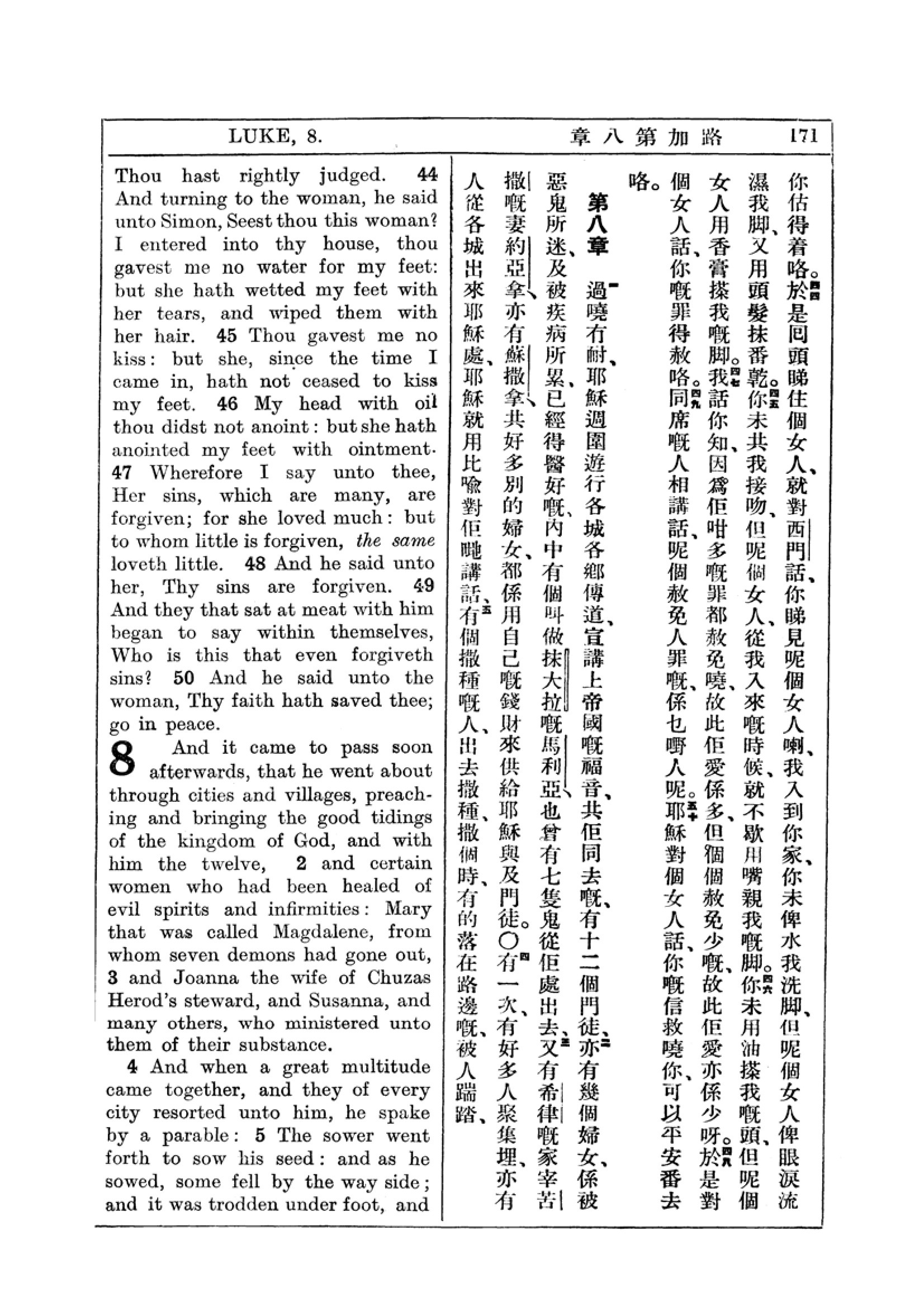 1927年新約全書(中英對照) 路加福音 7 章 44 節到 8 章 5 節