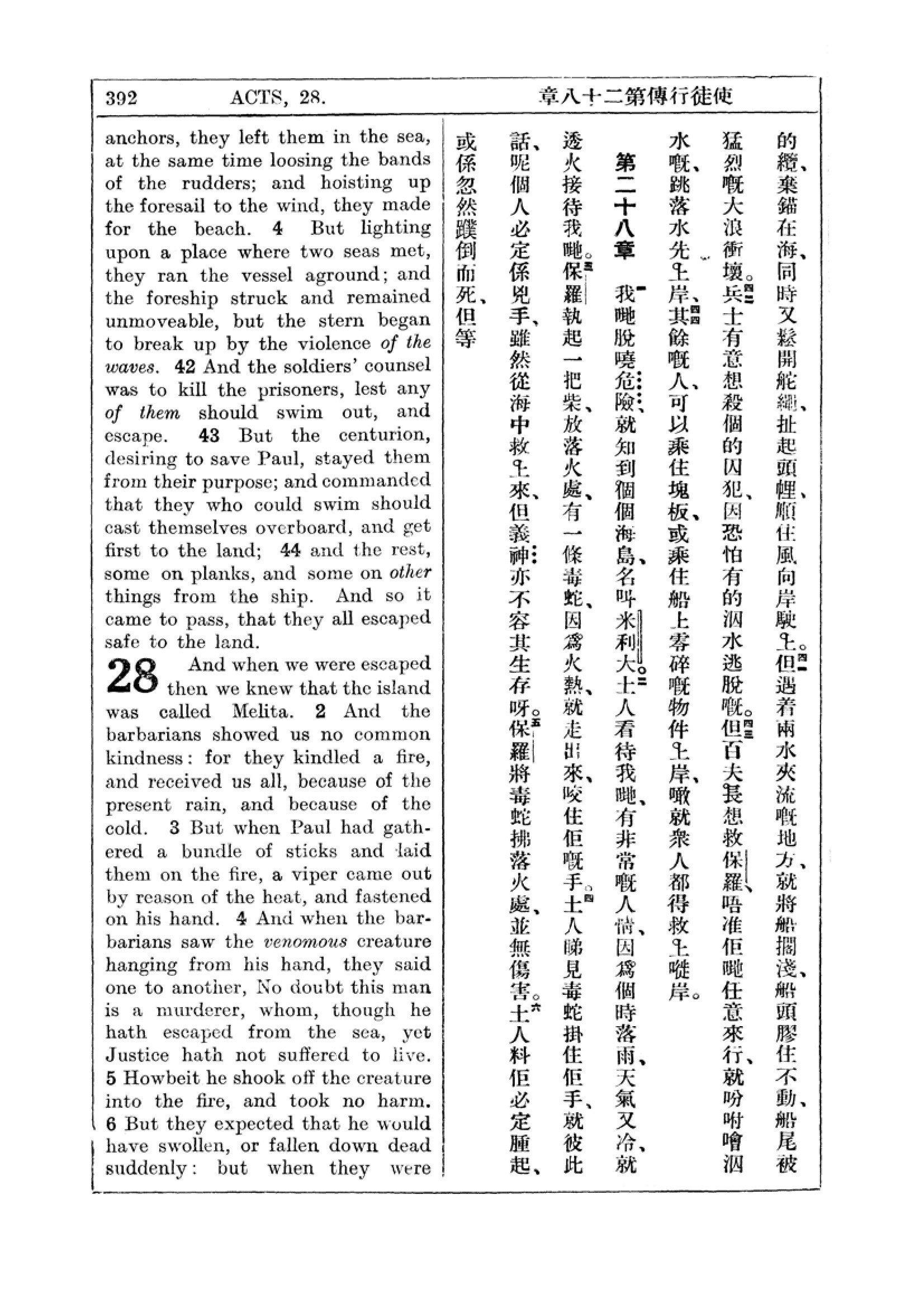 1927年新約全書(中英對照) 使徒行傳 27 章 40 節到 28 章 6 節