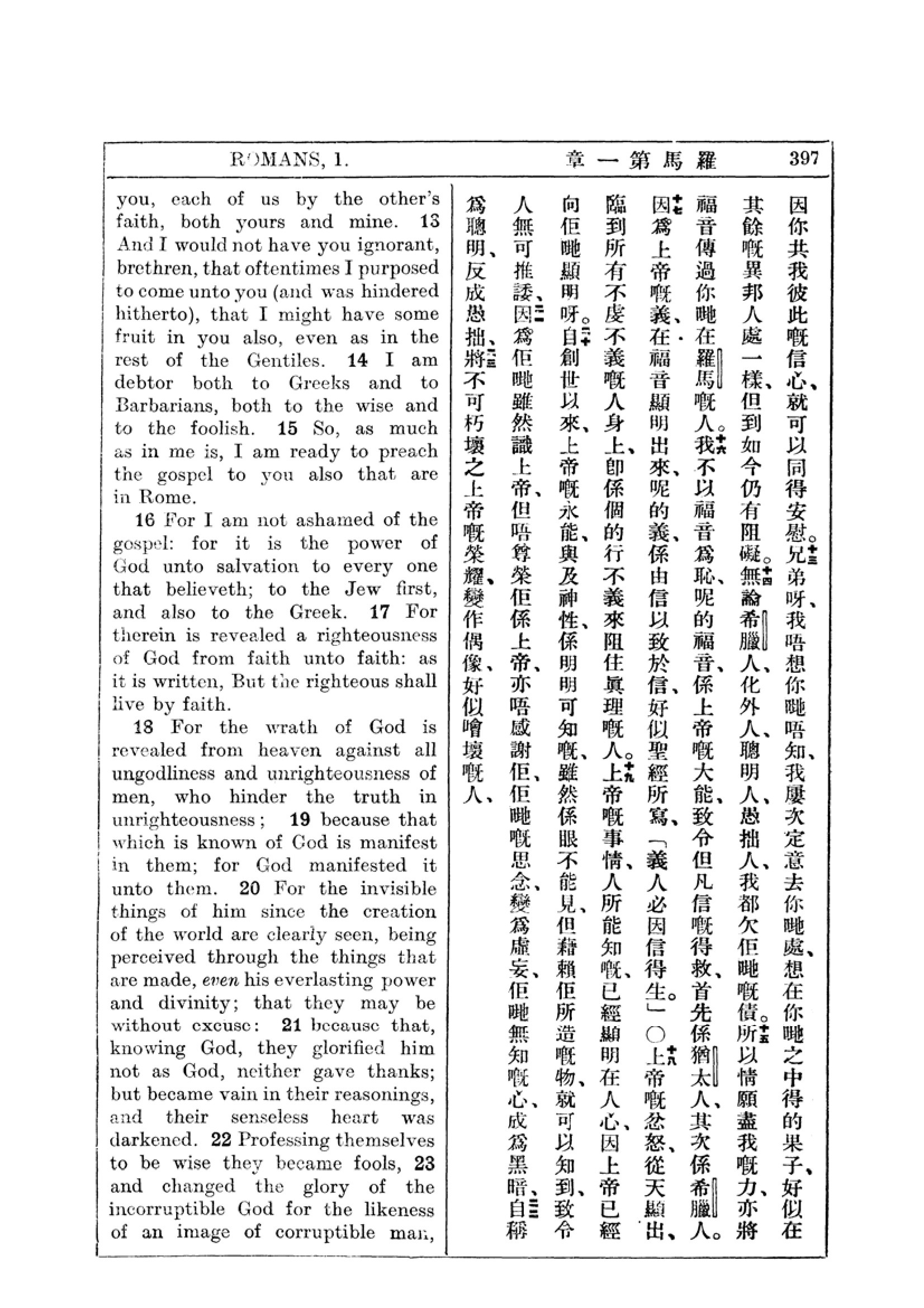 1927年新約全書(中英對照) 羅馬書 1 章 13 節到 1 章 23 節