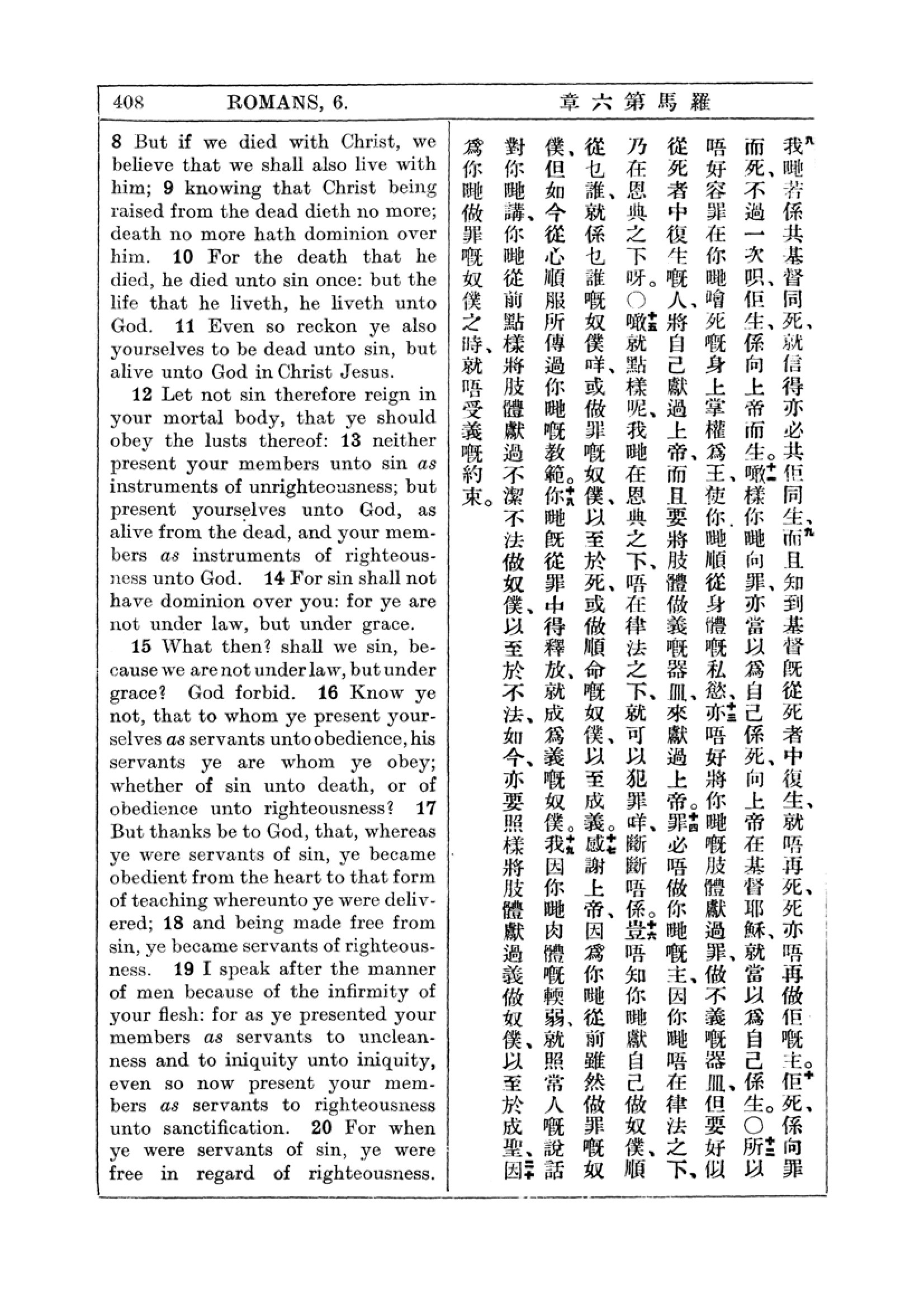1927年新約全書(中英對照) 羅馬書 6 章 8 節到 6 章 20 節