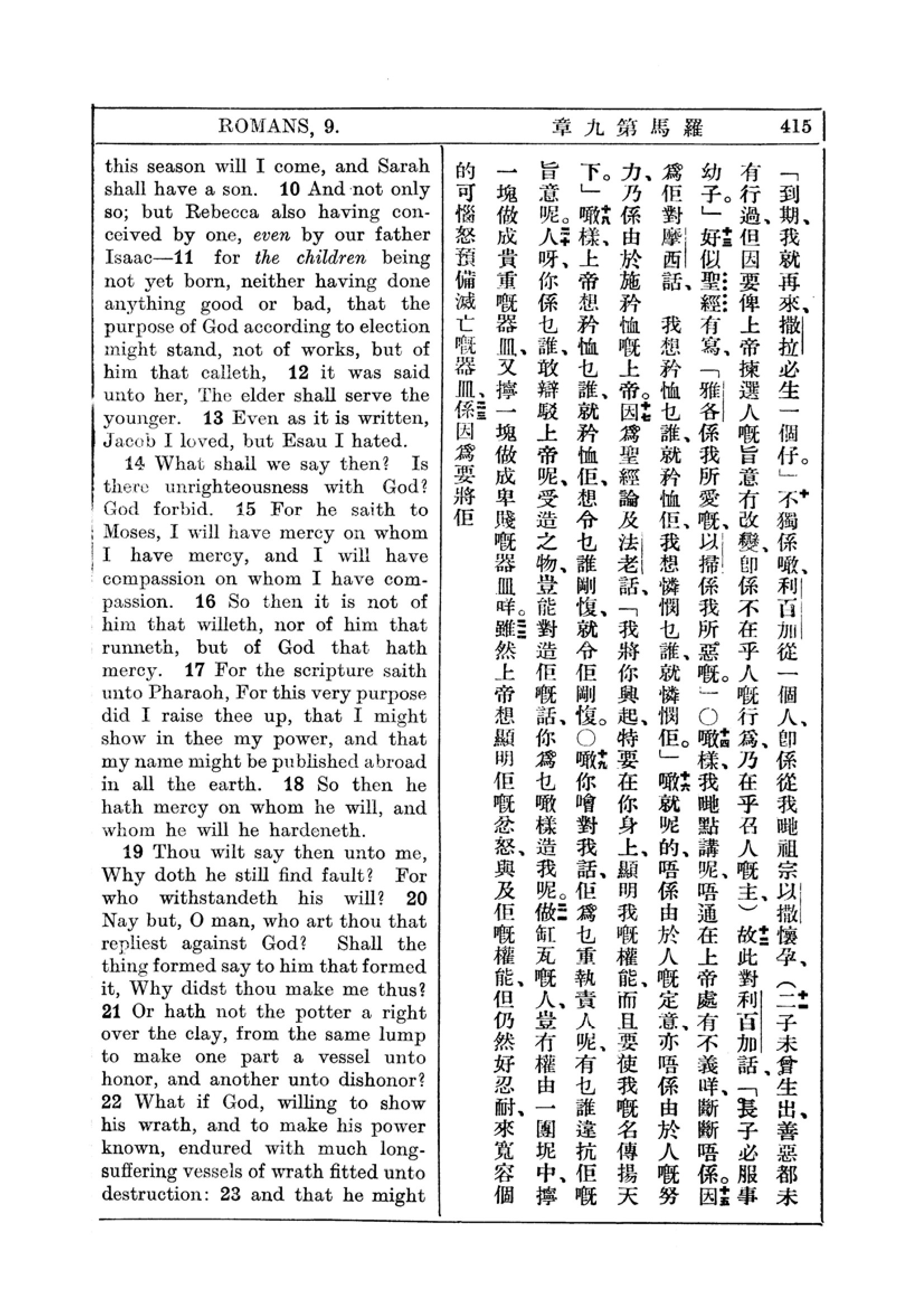 1927年新約全書(中英對照) 羅馬書 9 章 10 節到 9 章 22 節
