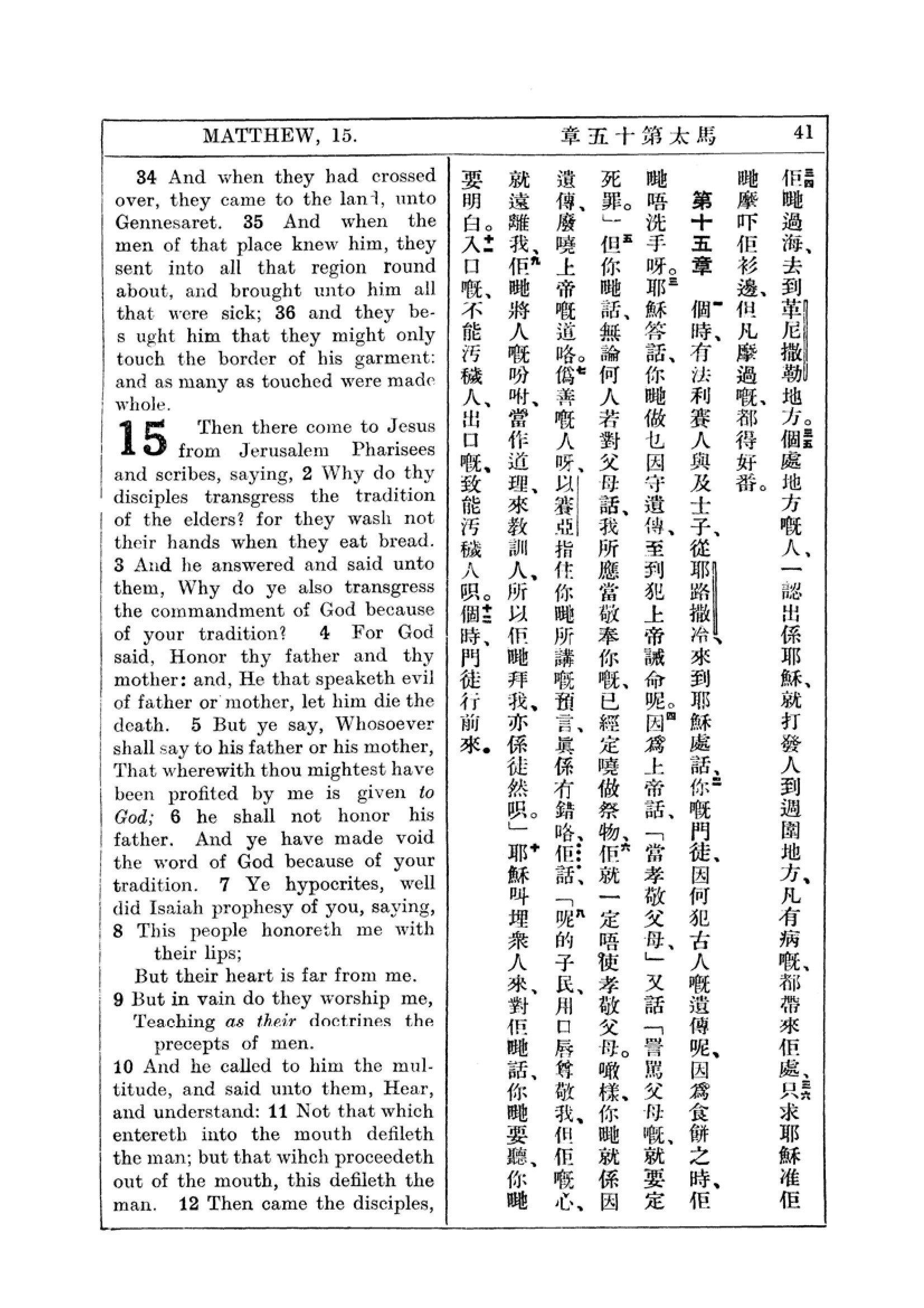 1927年新約全書(中英對照) 馬太福音 14 章 34 節到 15 章 12 節