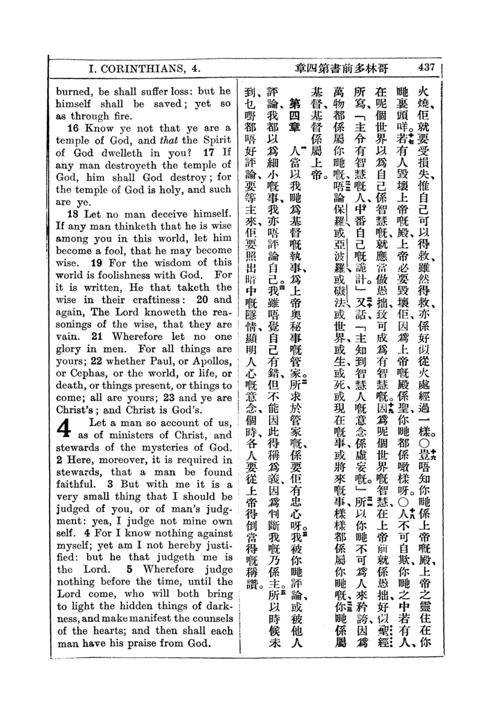 1927年新約全書(中英對照) 哥林多前書 3 章 15 節到 4 章 5 節