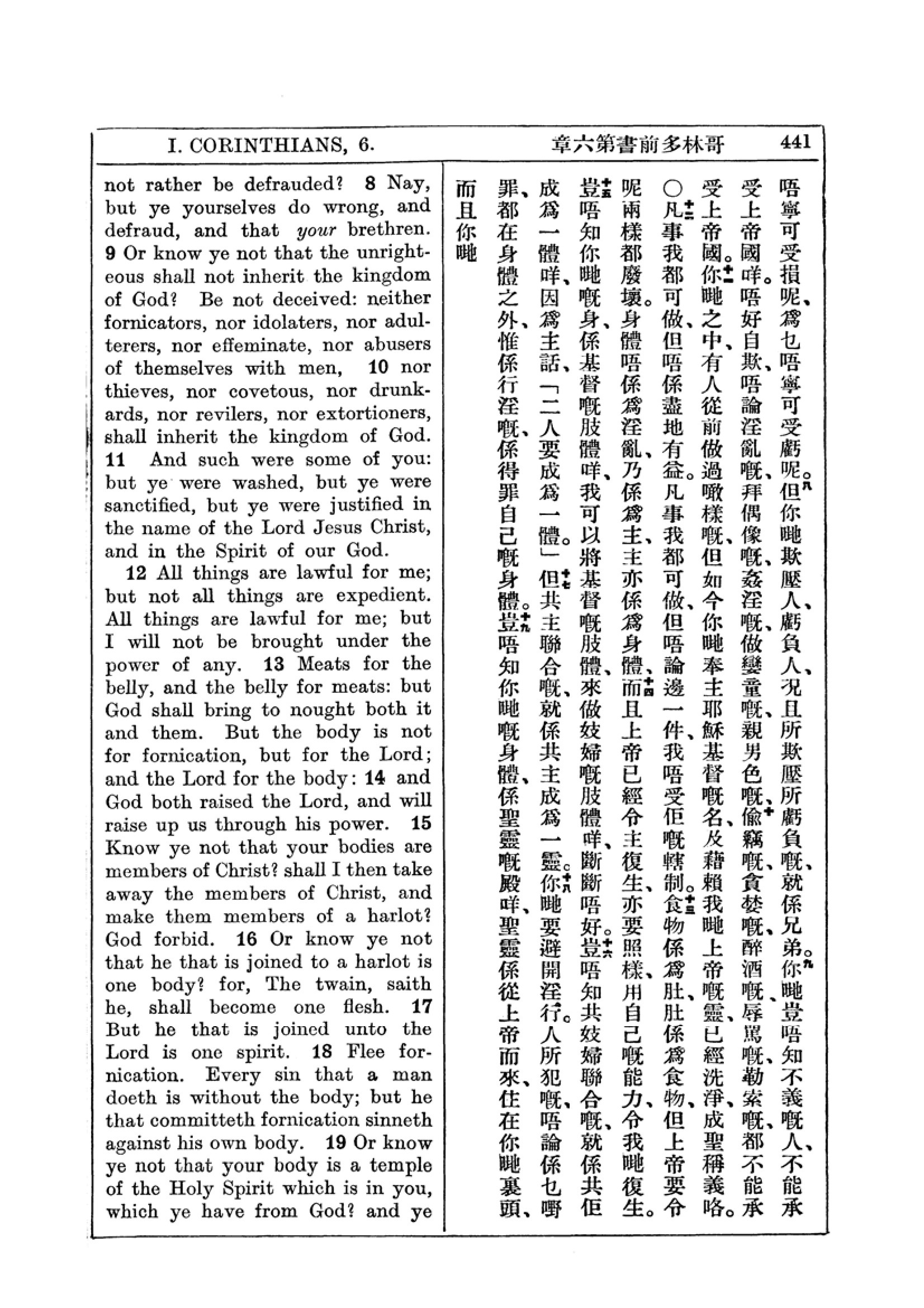 1927年新約全書(中英對照) 哥林多前書 6 章 8 節到 6 章 19 節