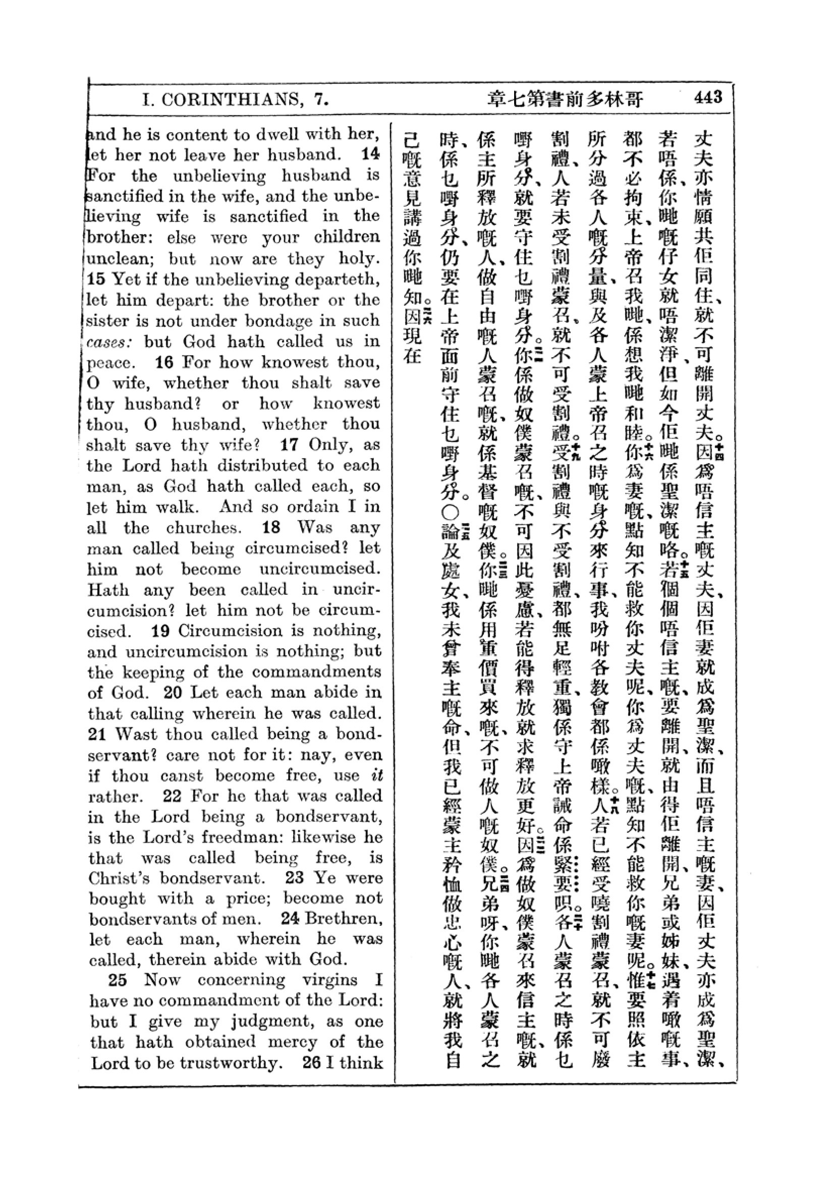 1927年新約全書(中英對照) 哥林多前書 7 章 14 節到 7 章 25 節