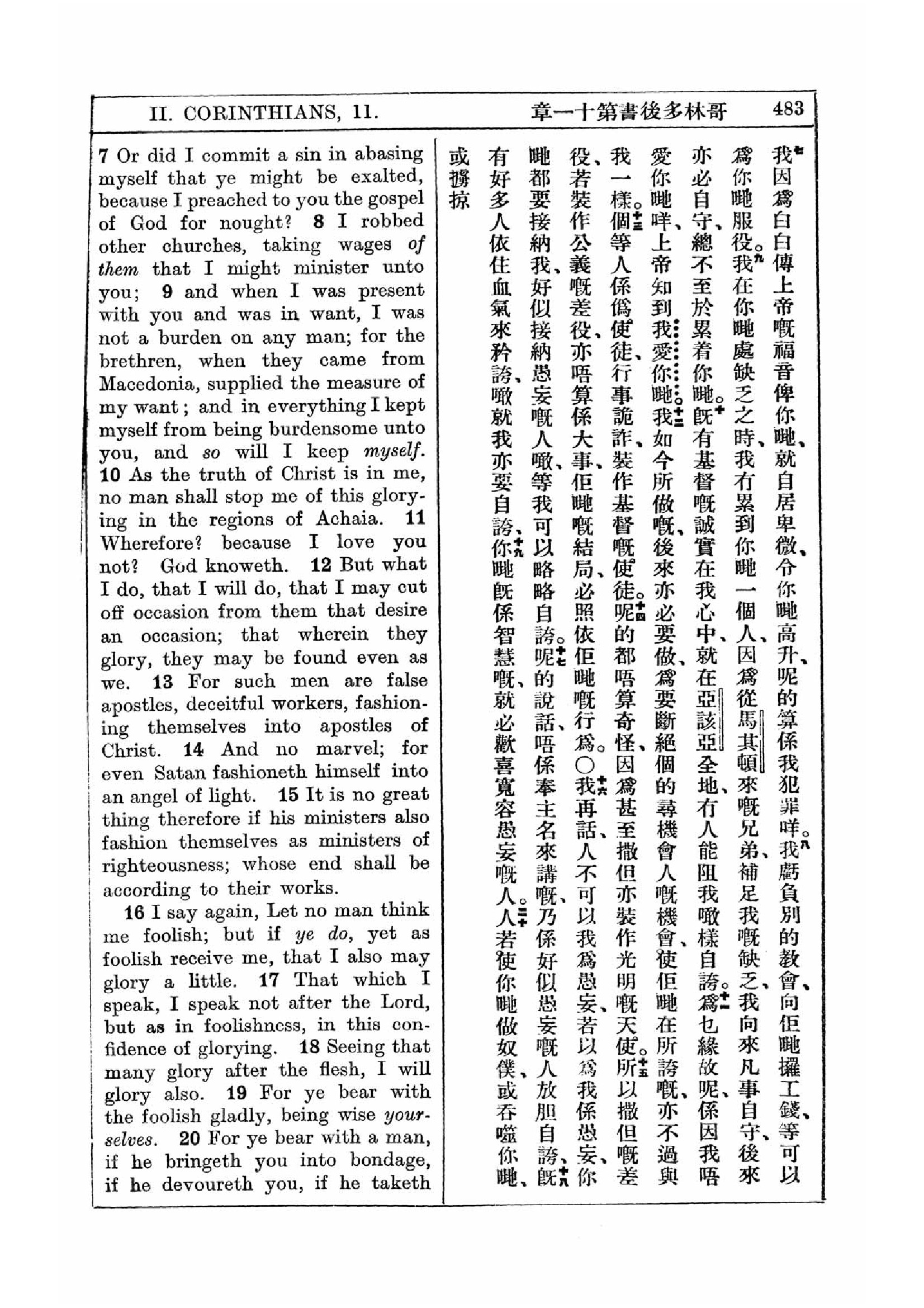 1927年新約全書(中英對照) 哥林多後書 11 章 7 節到 11 章 20 節