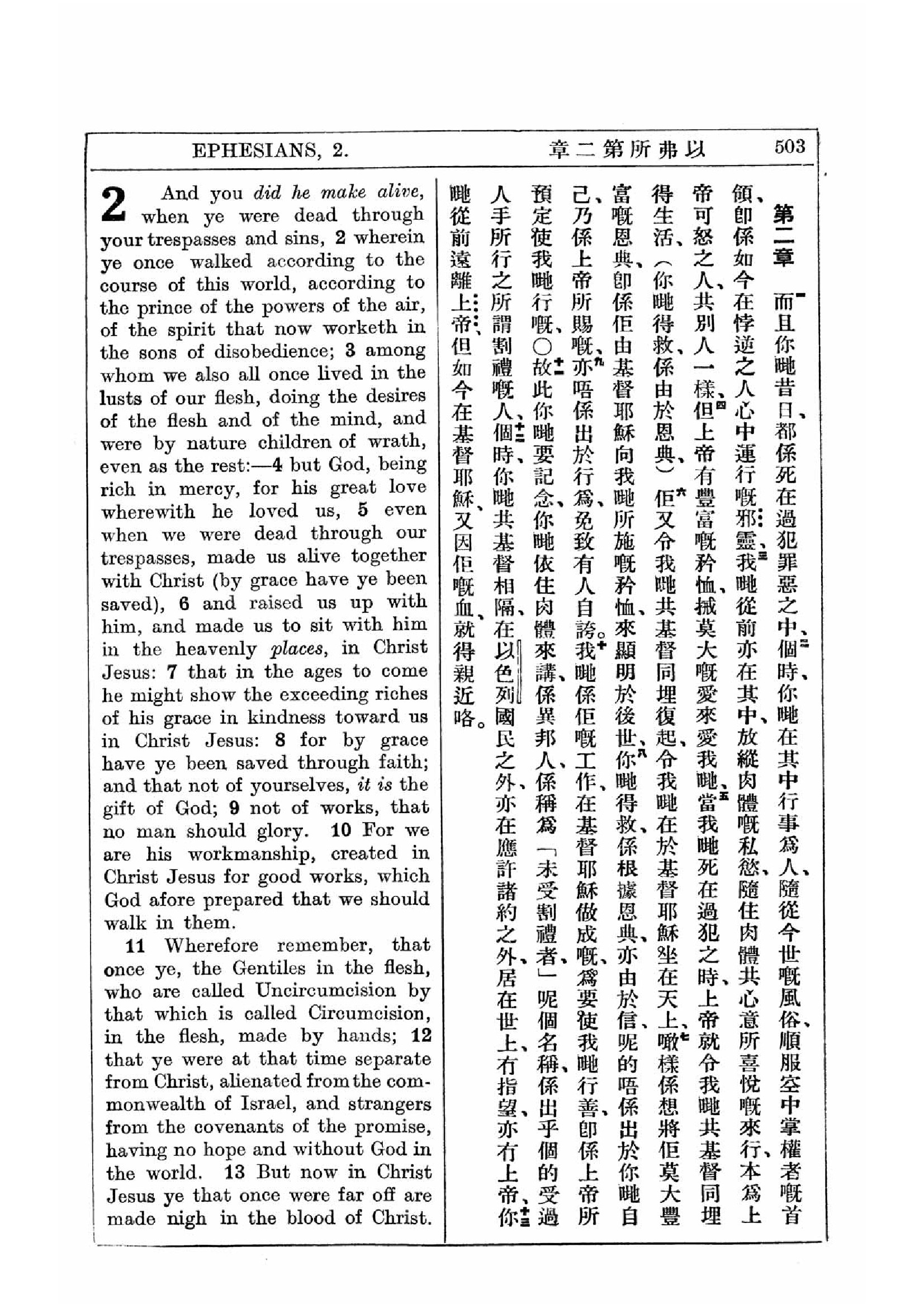 1927年新約全書(中英對照) 以弗所書 2 章 1 節到 2 章 13 節