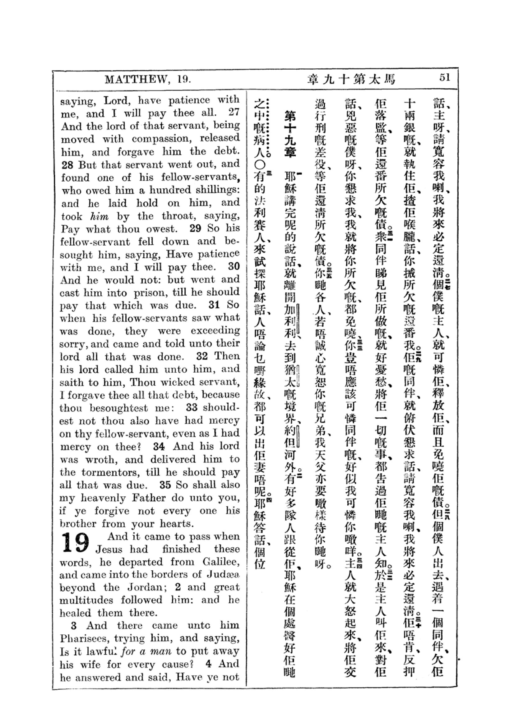 1927年新約全書(中英對照) 馬太福音 18 章 27 節到 19 章 4 節