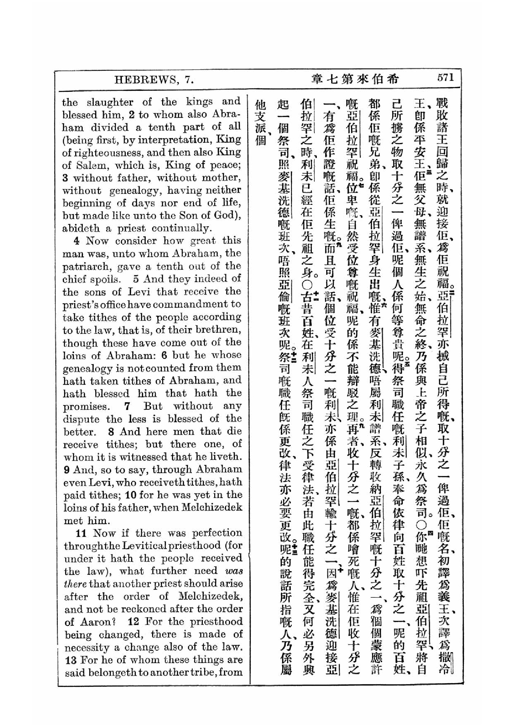 1927年新約全書(中英對照) 希伯來書 7 章 2 節到 7 章 13 節