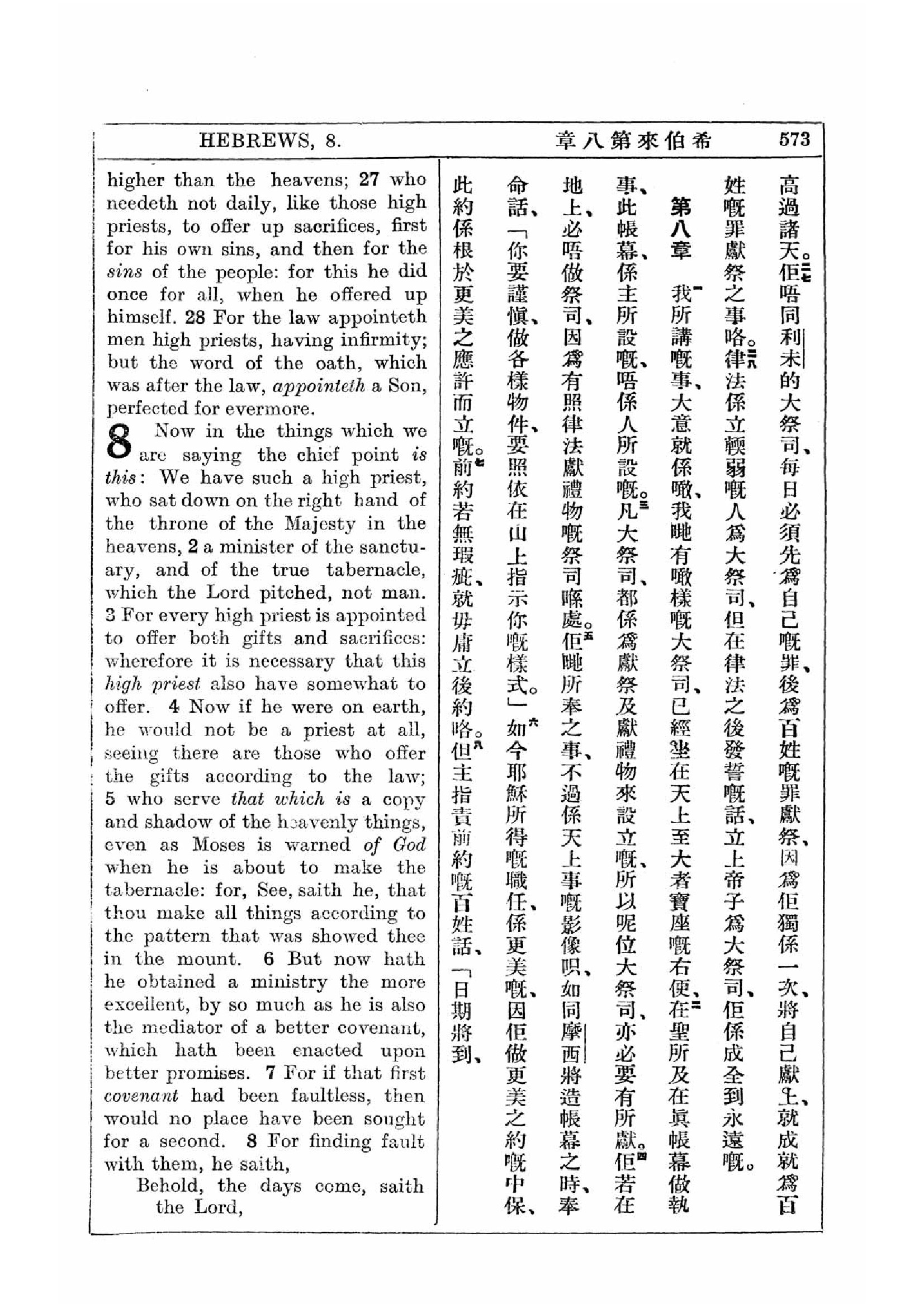 1927年新約全書(中英對照) 希伯來書 7 章 27 節到 8 章 8 節