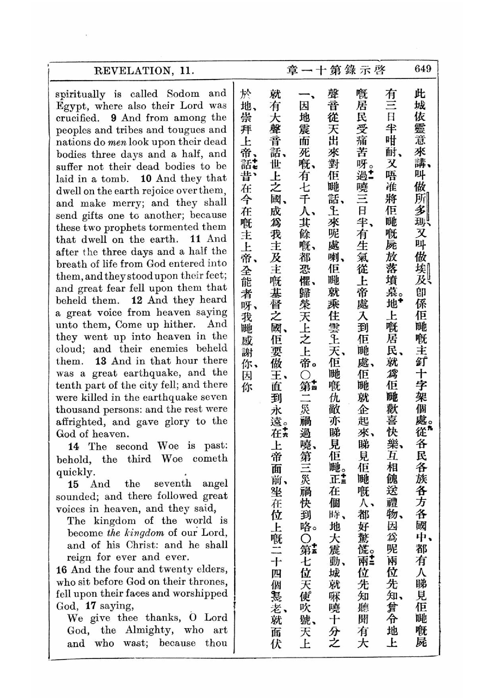 1927年新約全書(中英對照) 啟示錄 11 章 9 節到 11 章 17 節