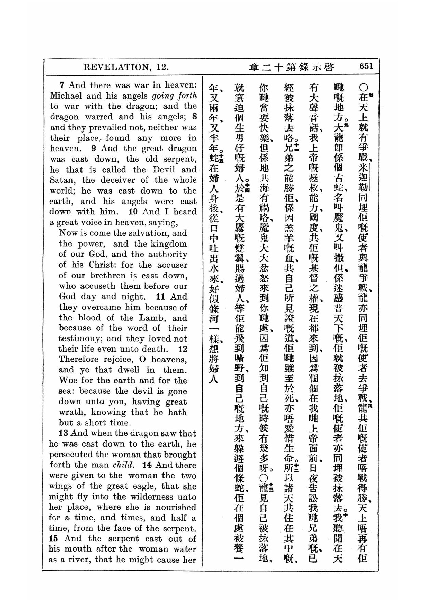 1927年新約全書(中英對照) 啟示錄 12 章 7 節到 12 章 15 節