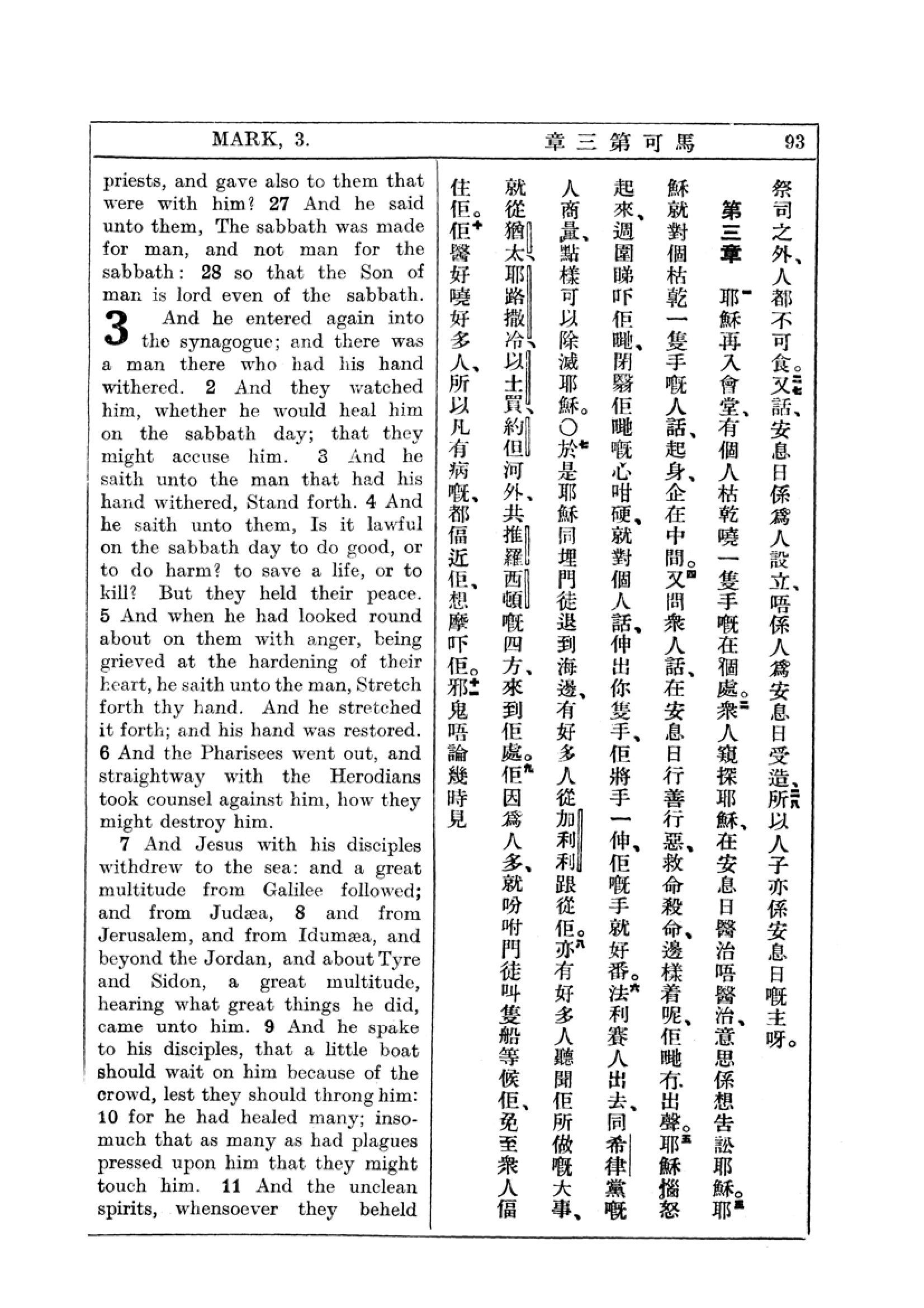 1927年新約全書(中英對照) 馬可福音 2 章 27 節到 3 章 10 節