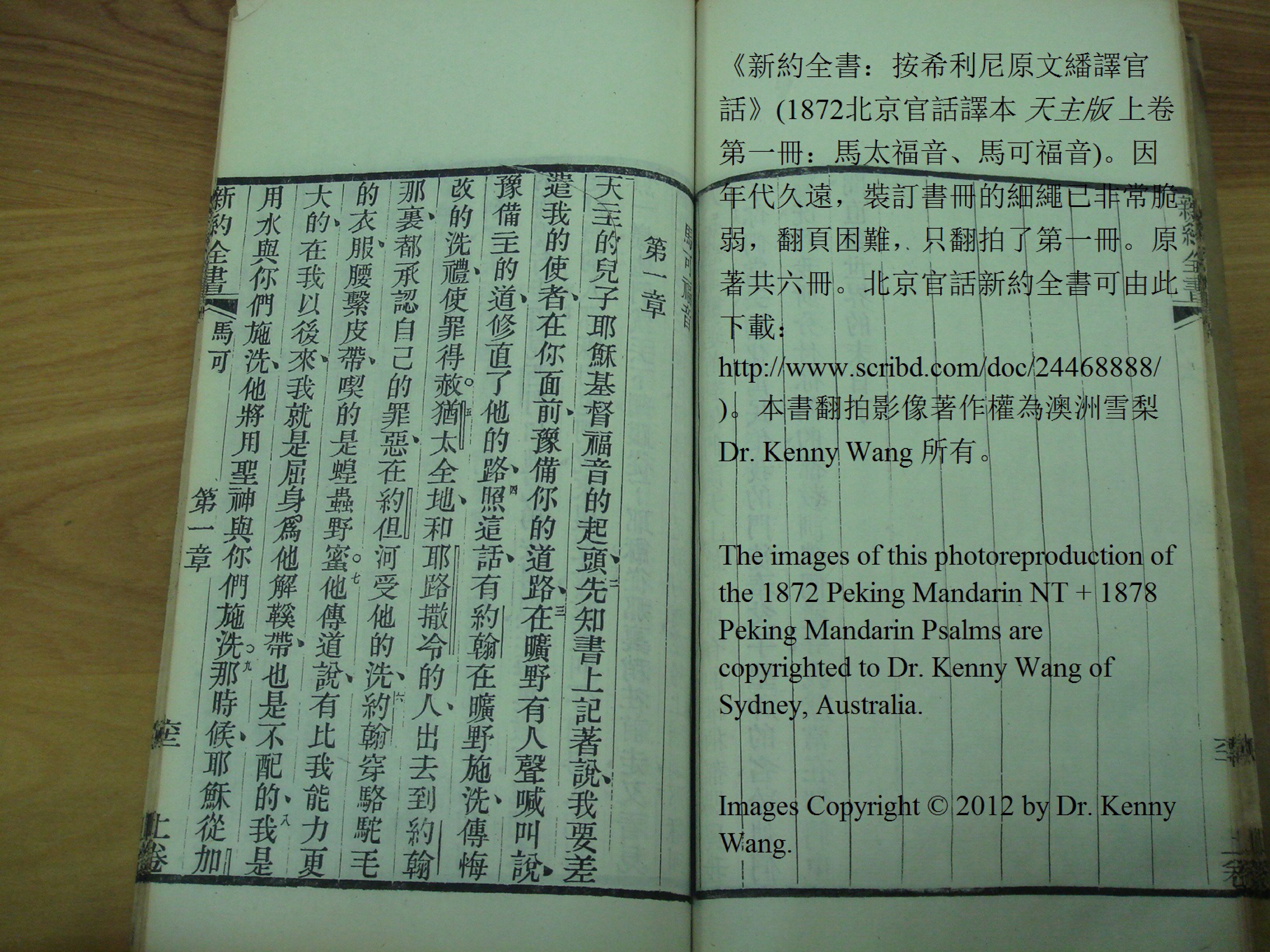 1872年新約全書(按希利尼原文翻譯官話、第一冊) 馬可福音 1 章 1 節到 1 章 9 節
