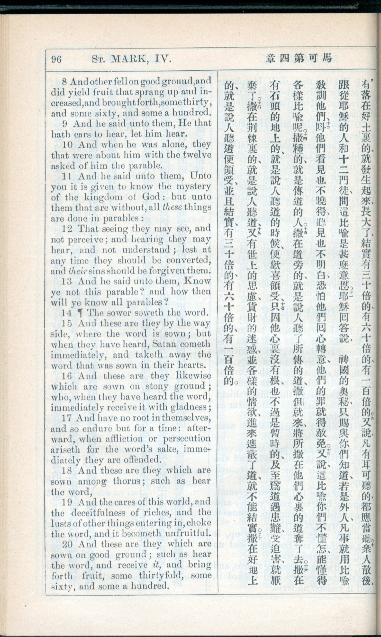 1908年新約全書(中西字) 馬可福音 4 章 8 節到 4 章 20 節