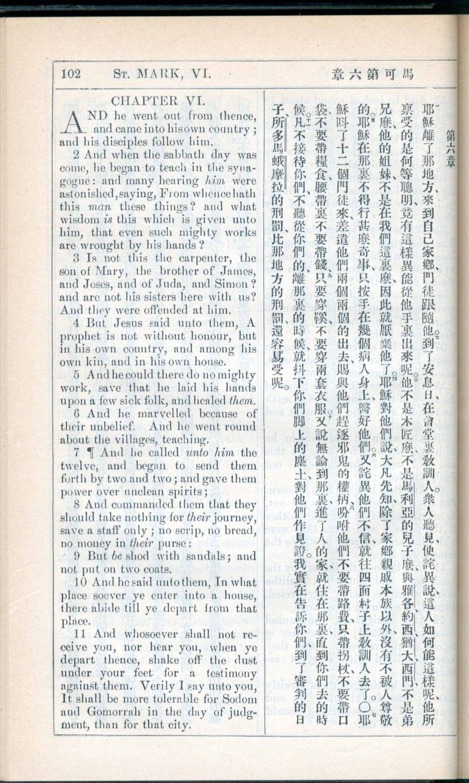 1908年新約全書(中西字) 馬可福音 6 章 1 節到 6 章 11 節