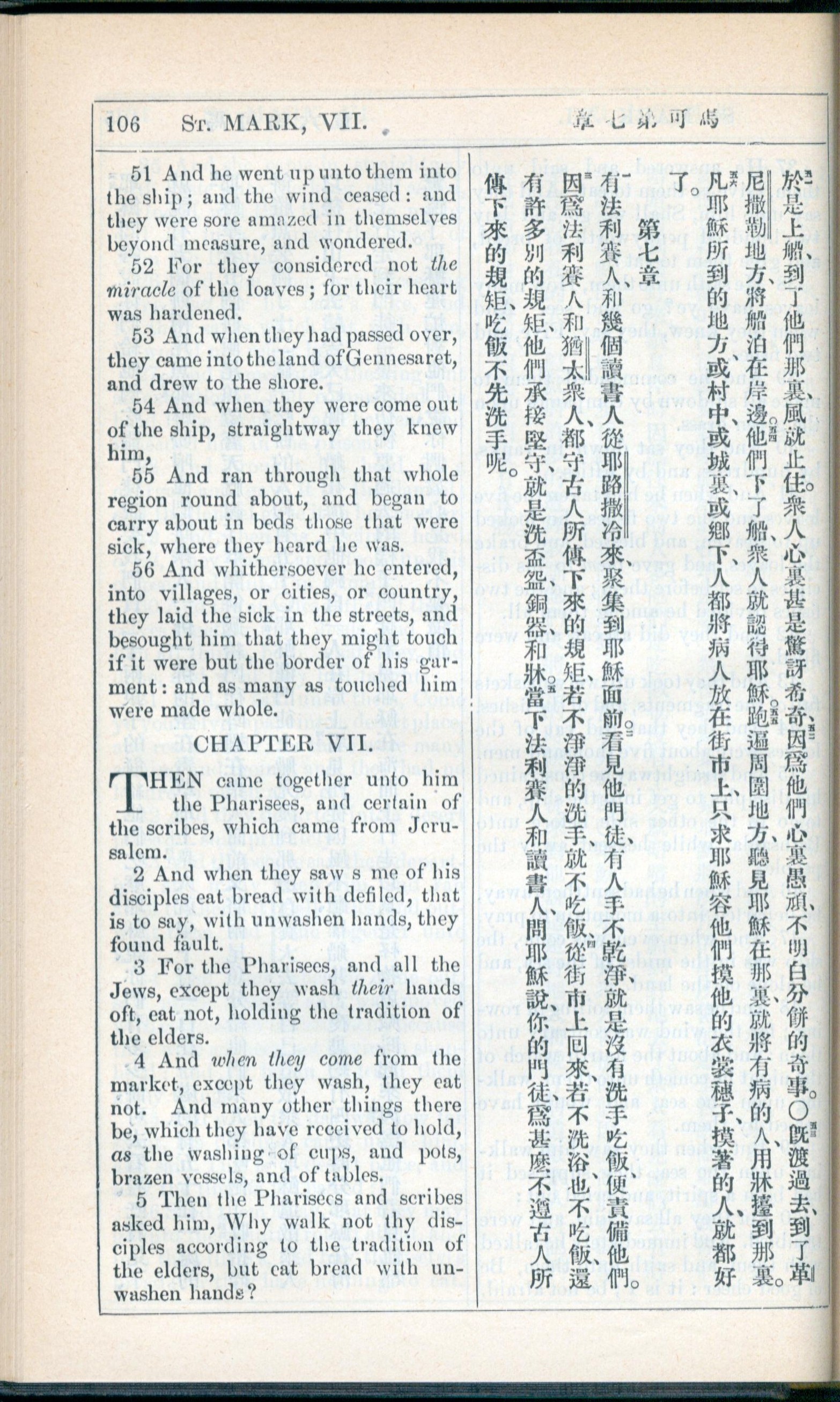 1908年新約全書(中西字) 馬可福音 6 章 51 節到 7 章 5 節