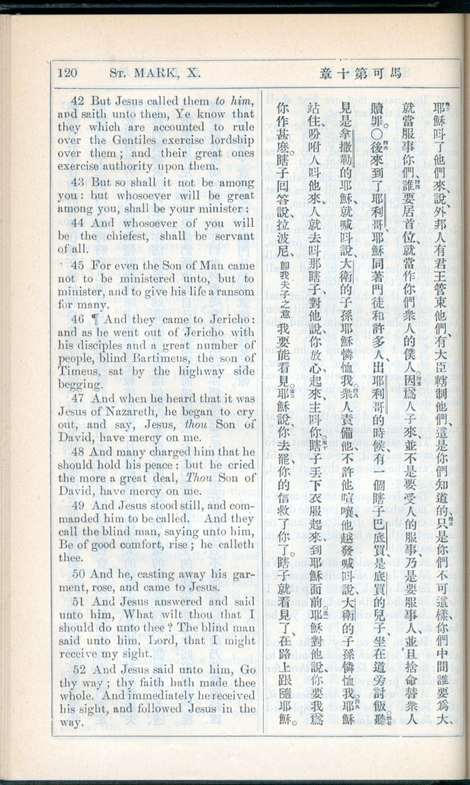 1908年新約全書(中西字) 馬可福音 10 章 42 節到 10 章 52 節
