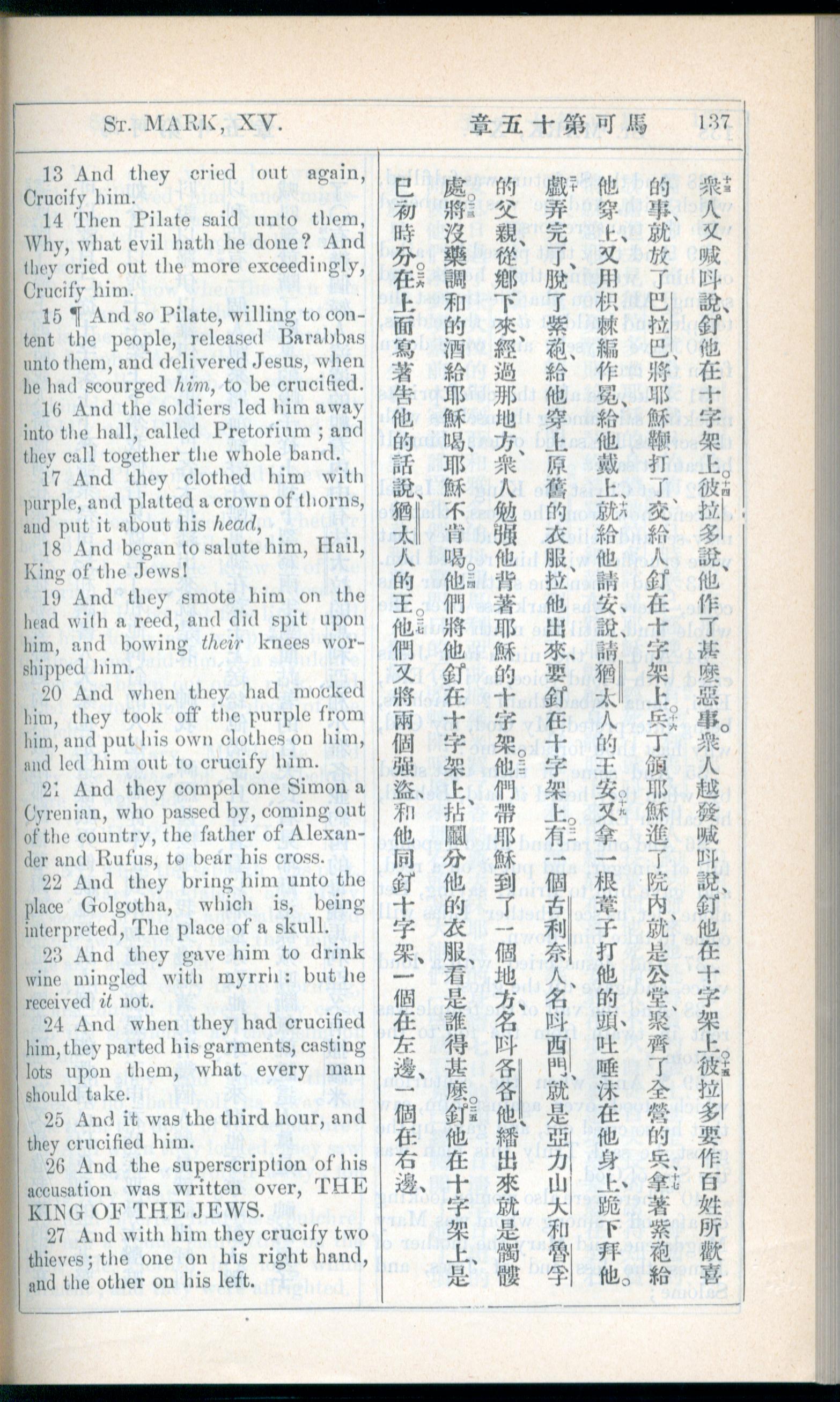 1908年新約全書(中西字) 馬可福音 15 章 13 節到 15 章 27 節