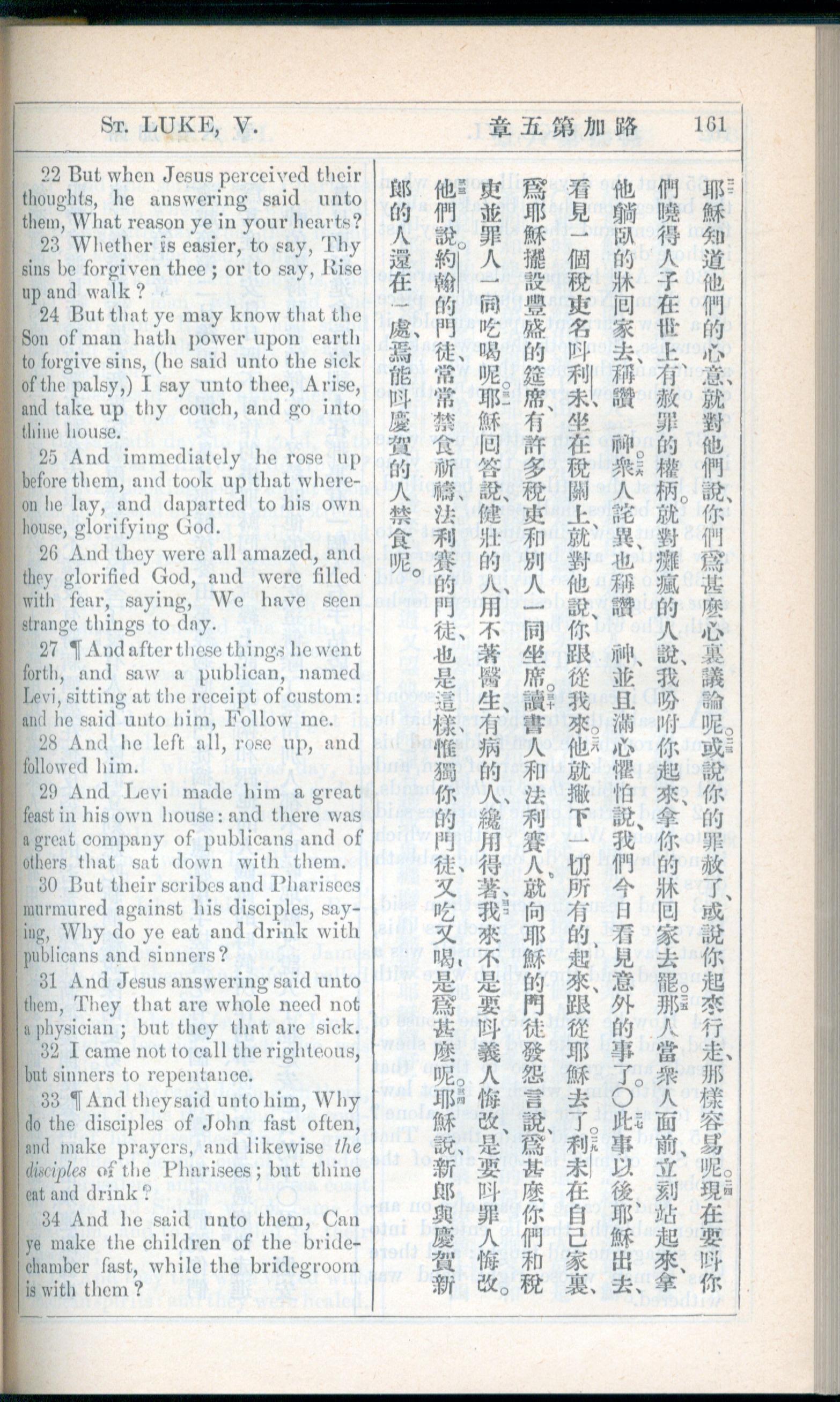 1908年新約全書(中西字) 路加福音 5 章 22 節到 5 章 34 節