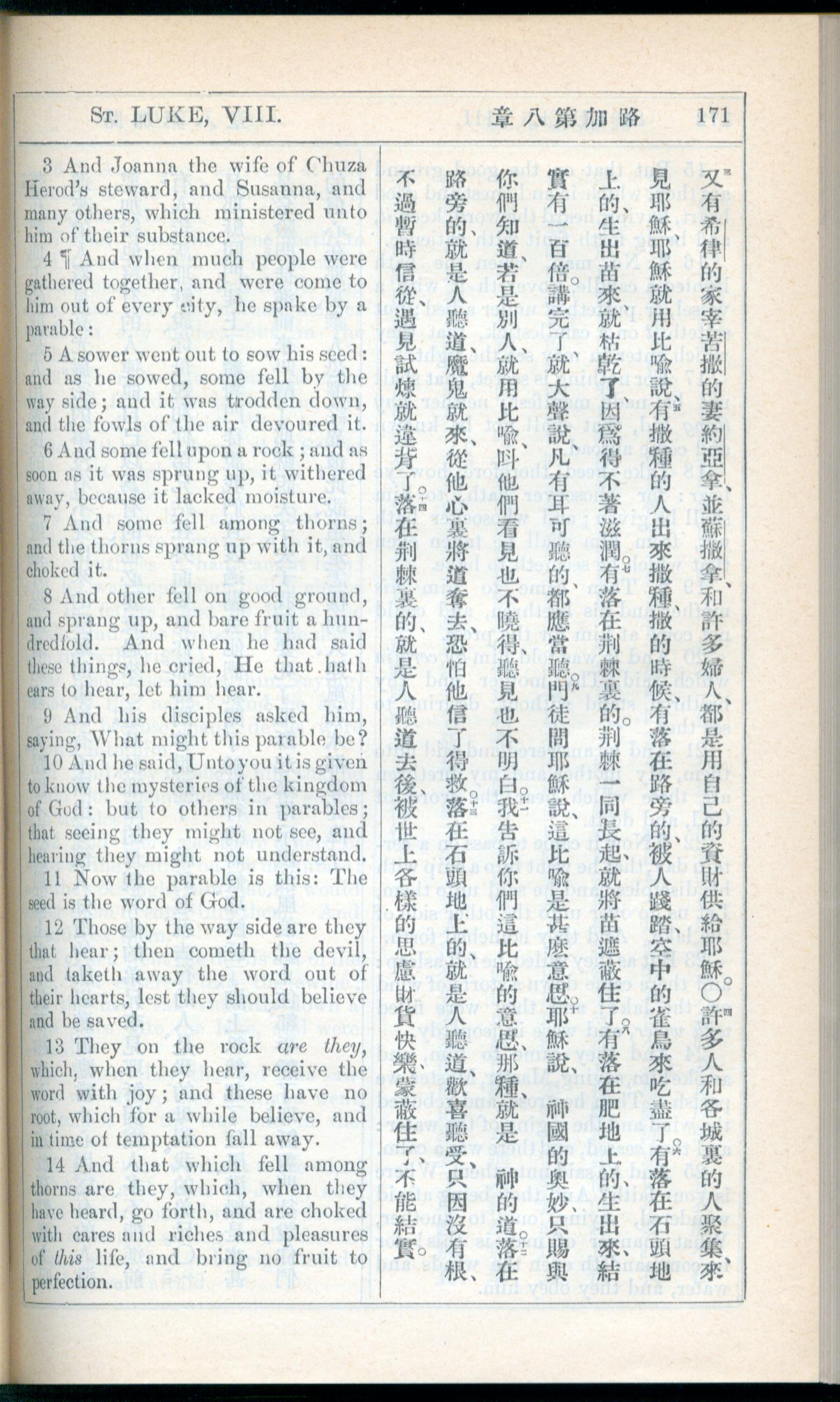 1908年新約全書(中西字) 路加福音 8 章 3 節到 8 章 14 節