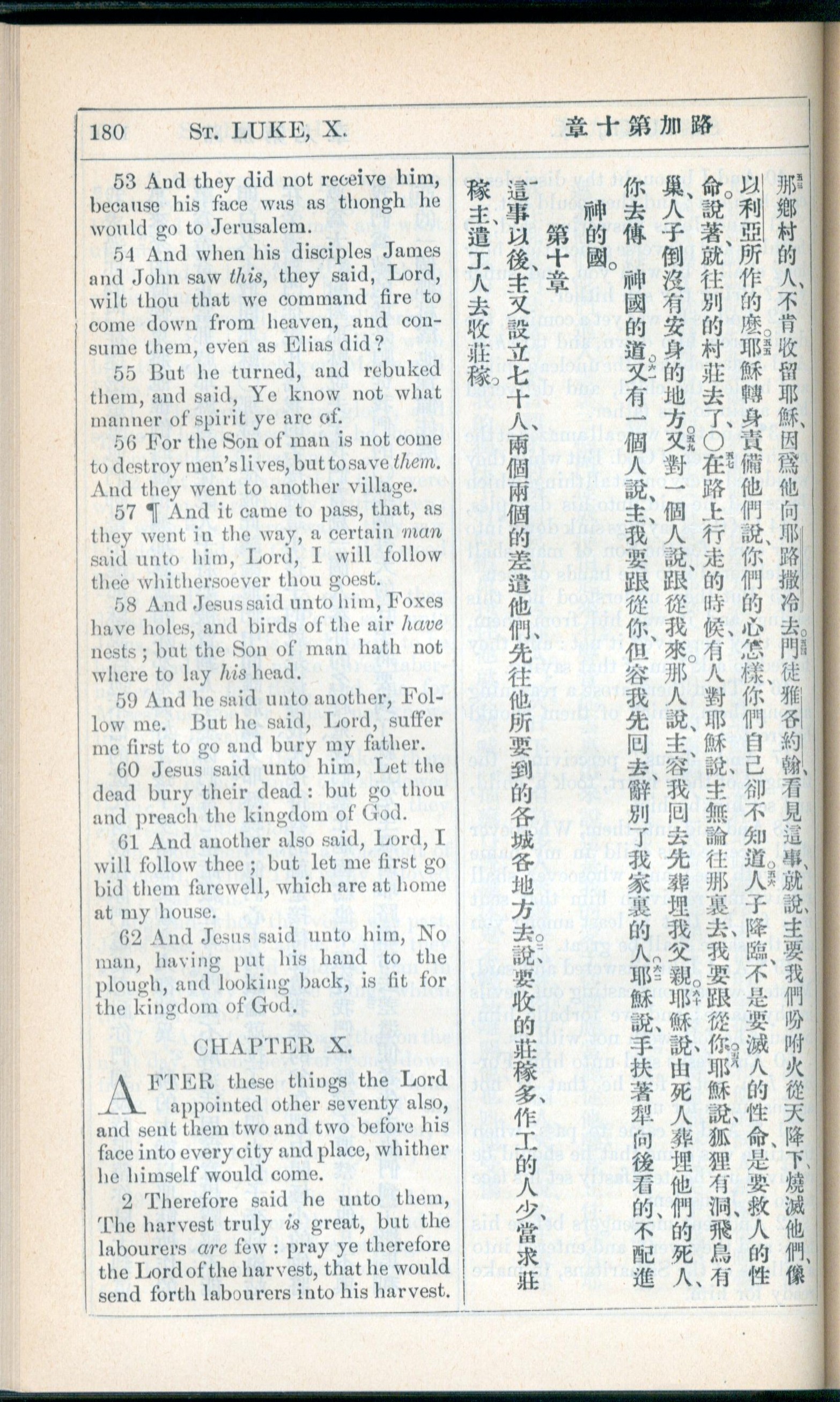 1908年新約全書(中西字) 路加福音 9 章 53 節到 10 章 2 節
