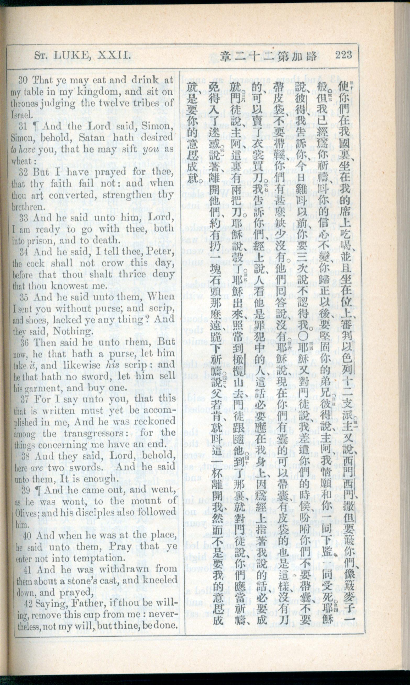 1908年新約全書(中西字) 路加福音 22 章 30 節到 22 章 42 節