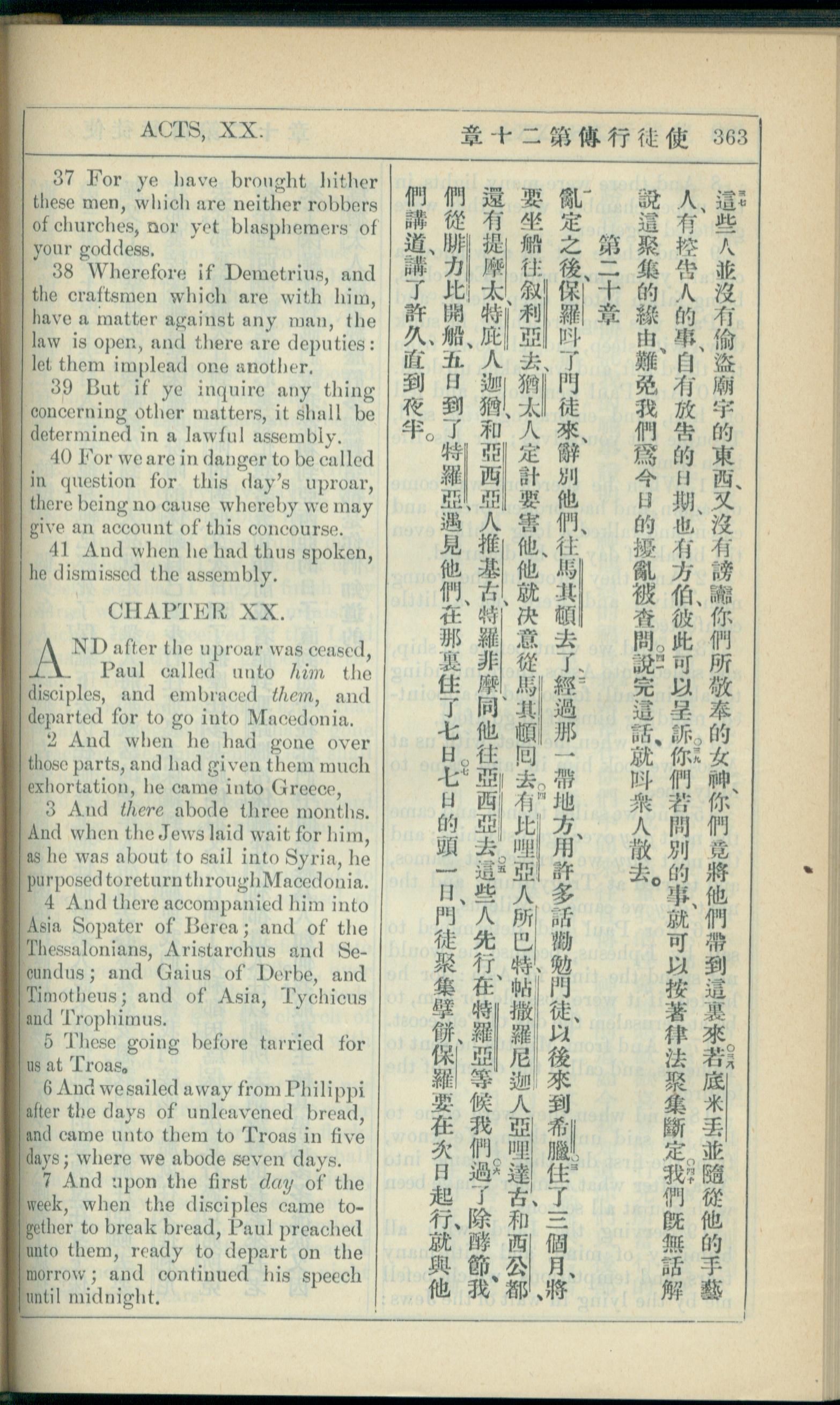 1908年新約全書(中西字) 使徒行傳 19 章 37 節到 20 章 7 節