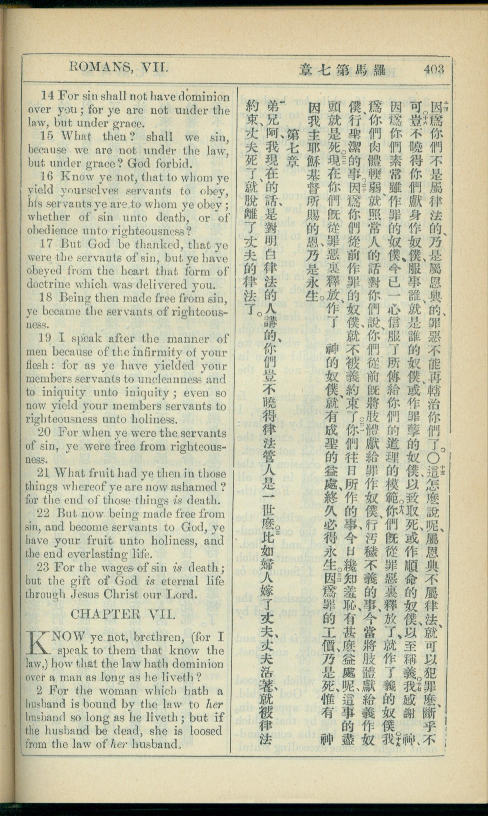 1908年新約全書(中西字) 羅馬書 6 章 14 節到 7 章 2 節