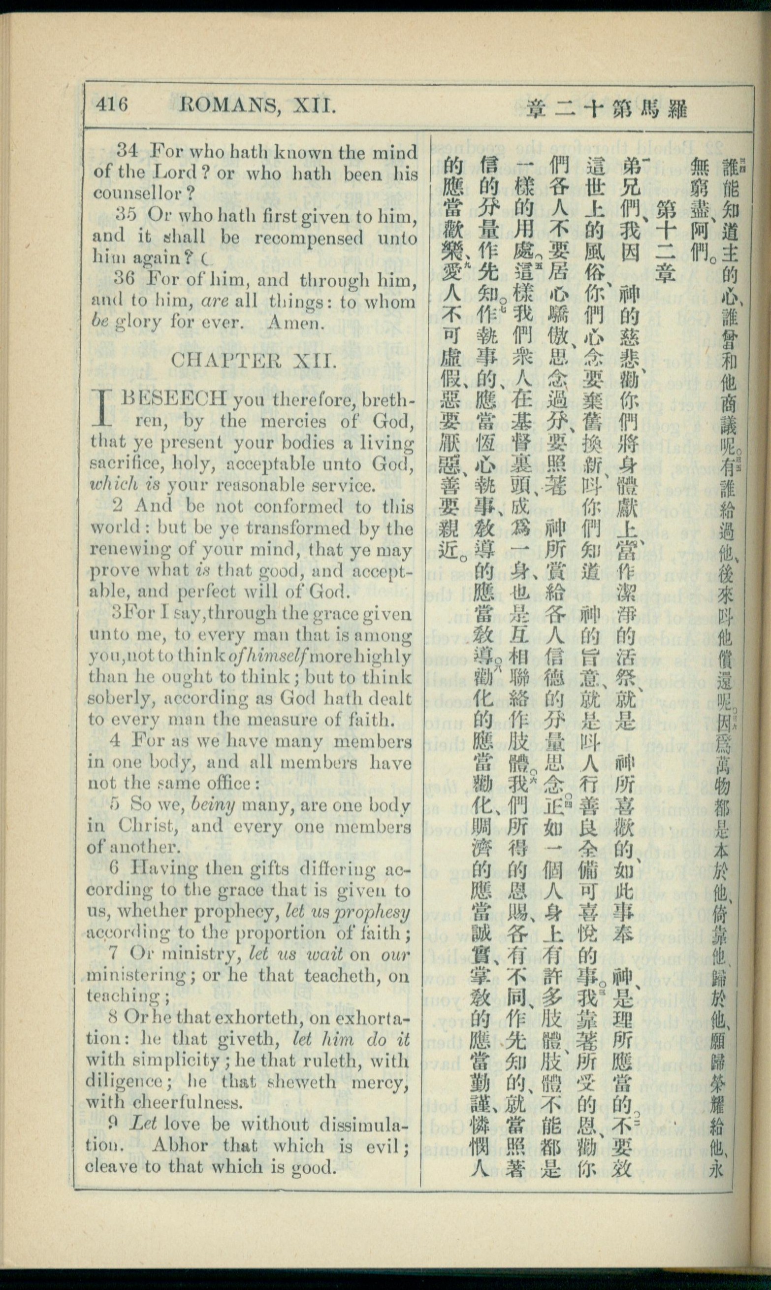 1908年新約全書(中西字) 羅馬書 11 章 34 節到 12 章 9 節