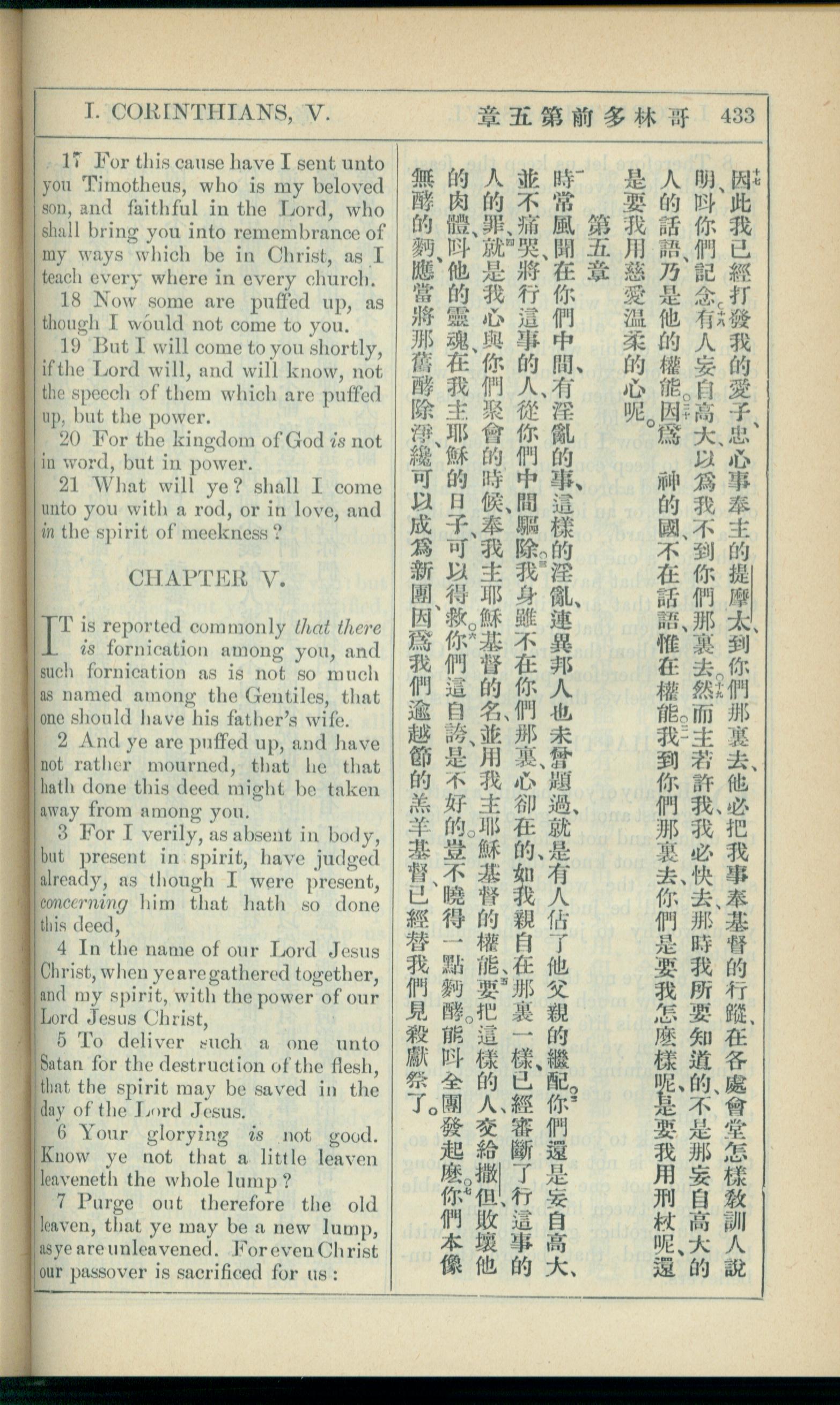 1908年新約全書(中西字) 哥林多前書 4 章 17 節到 5 章 7 節