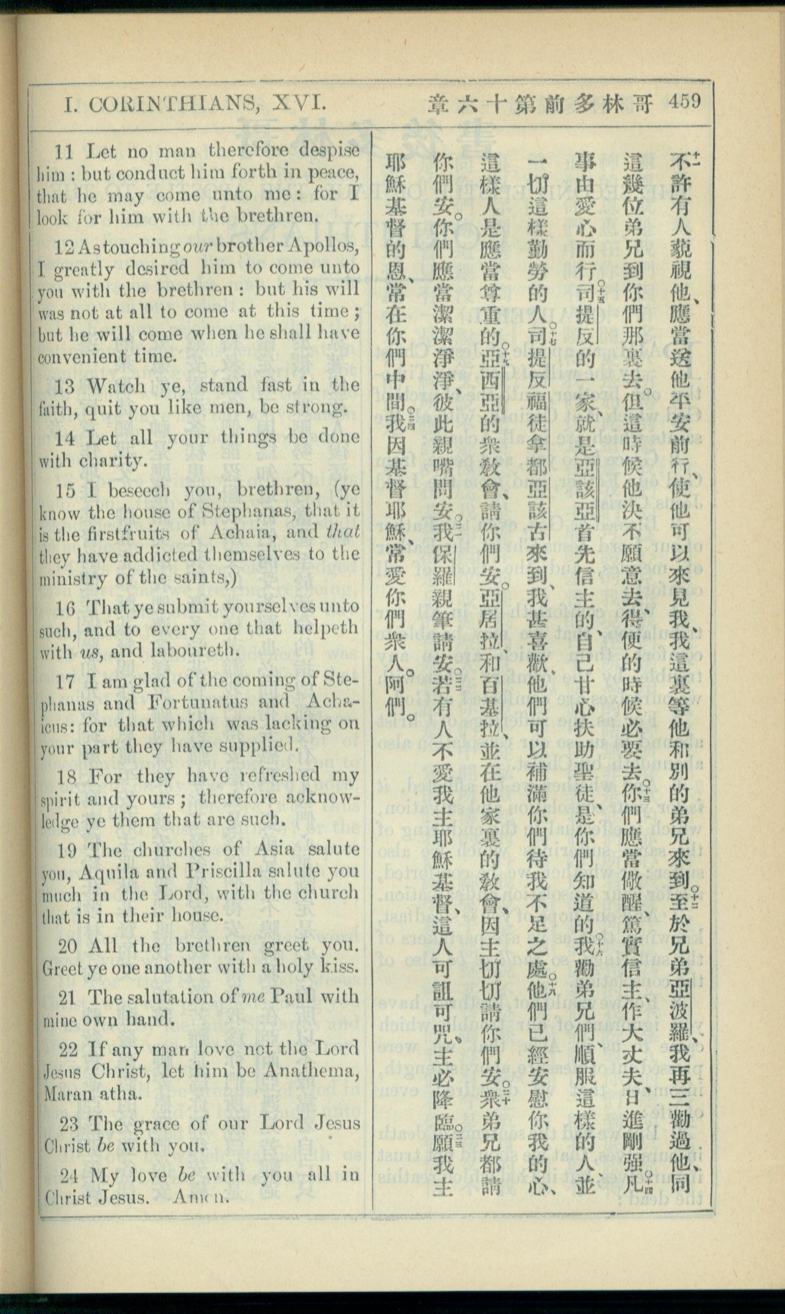 1908年新約全書(中西字) 哥林多前書 16 章 11 節到 16 章 24 節