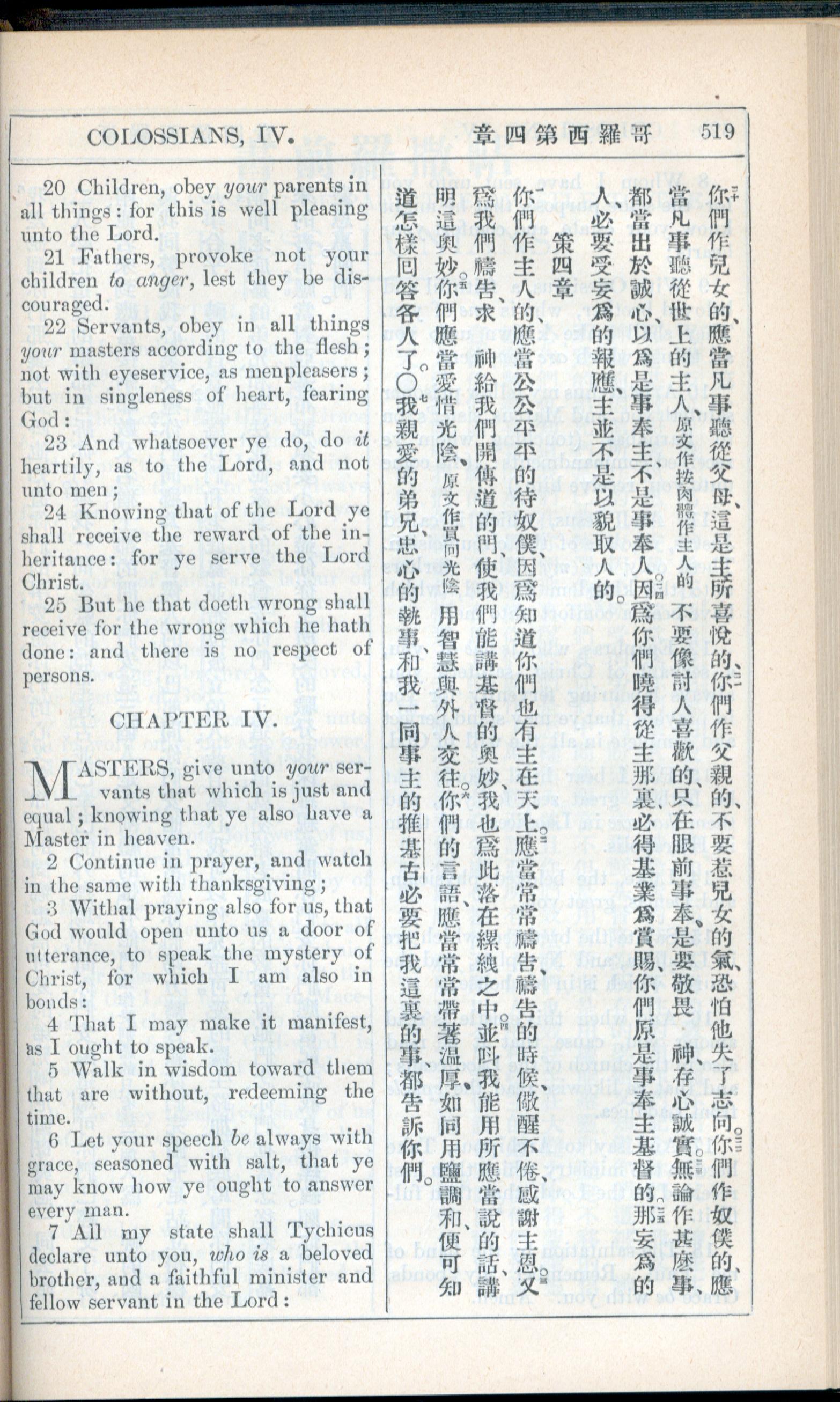 1908年新約全書(中西字) 歌羅西書 3 章 20 節到 4 章 7 節