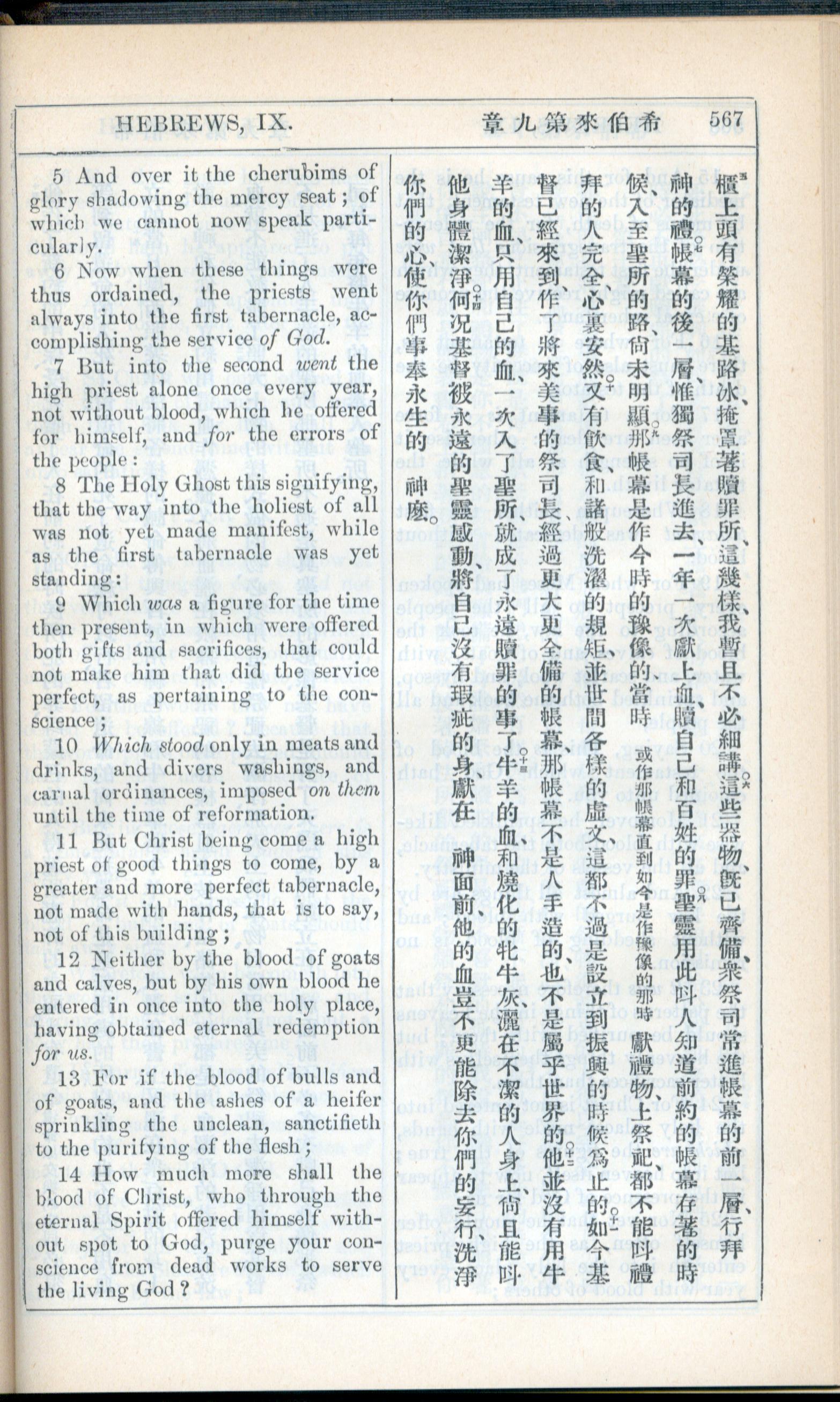 1908年新約全書(中西字) 希伯來書 9 章 5 節到 9 章 14 節