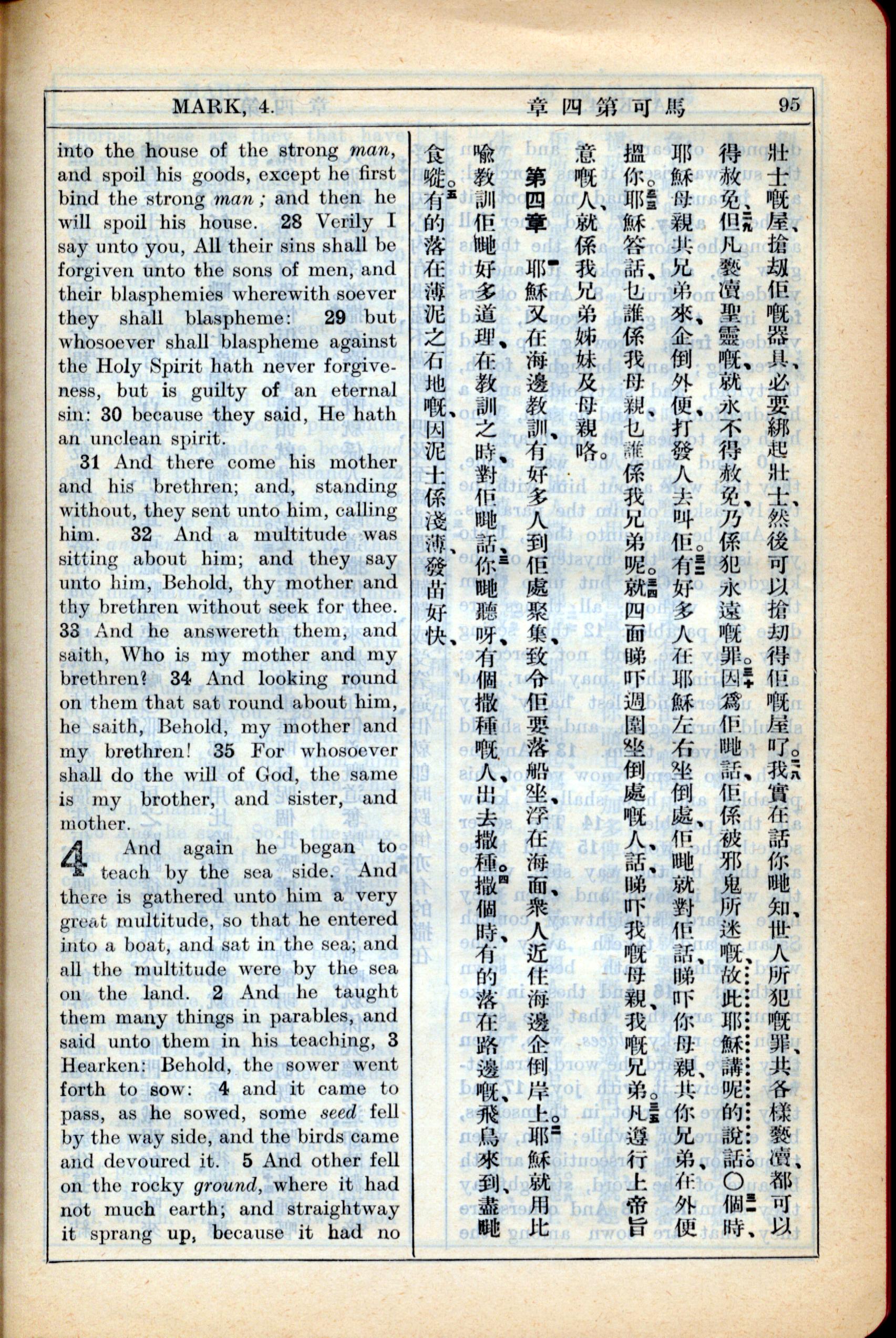 1931年新約全書廣東話新譯本與美國新譯英文 馬可福音 3 章 28 節到 4 章 5 節