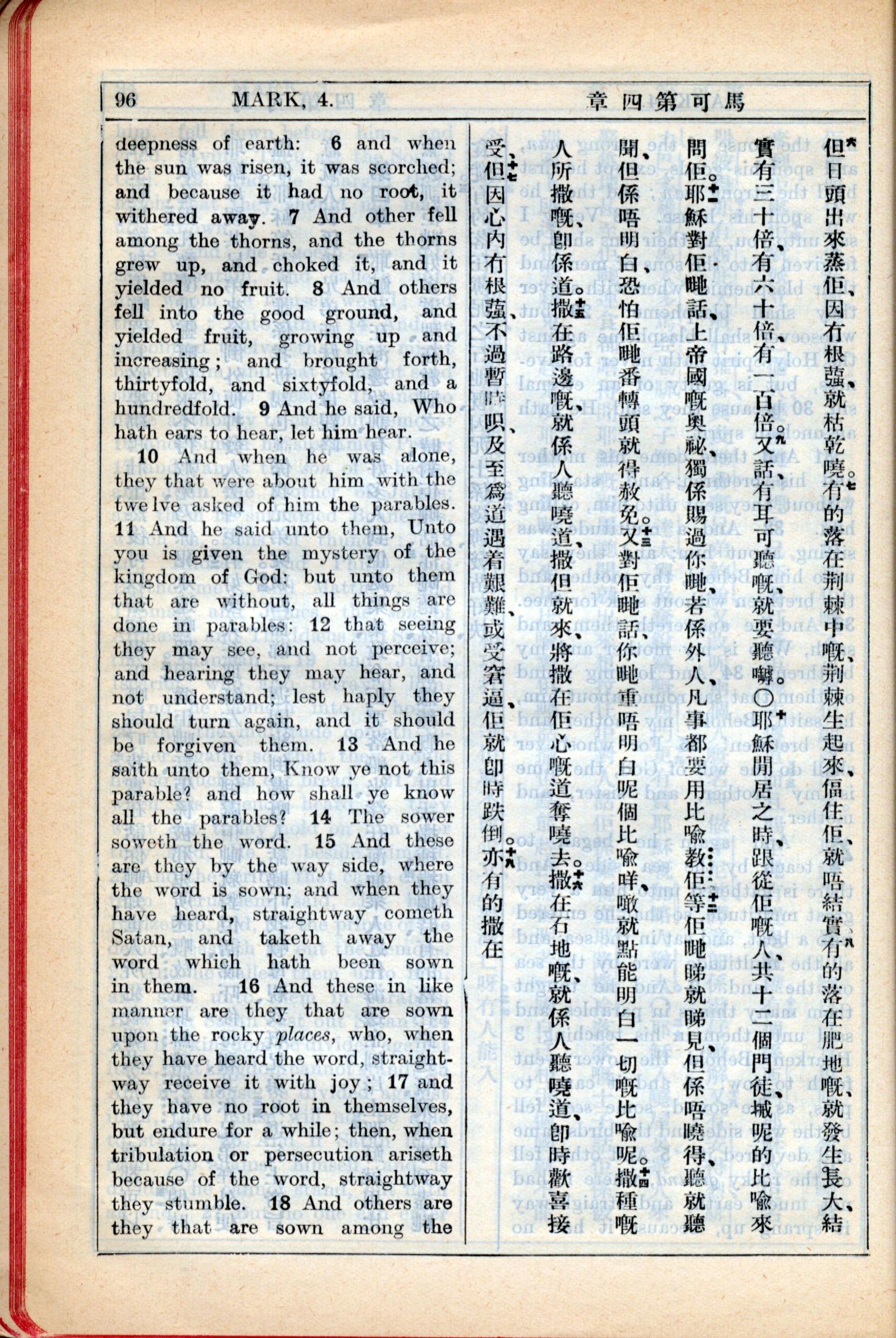 1931年新約全書廣東話新譯本與美國新譯英文 馬可福音 4 章 6 節到 4 章 18 節