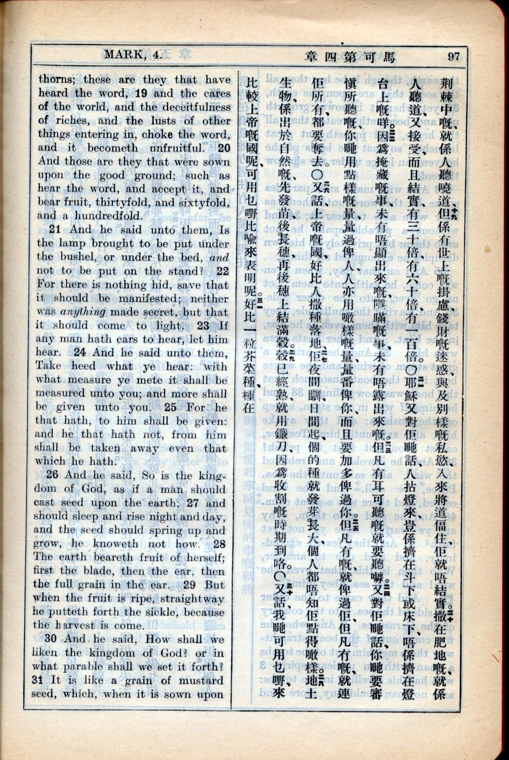 1931年新約全書廣東話新譯本與美國新譯英文 馬可福音 4 章 19 節到 4 章 31 節