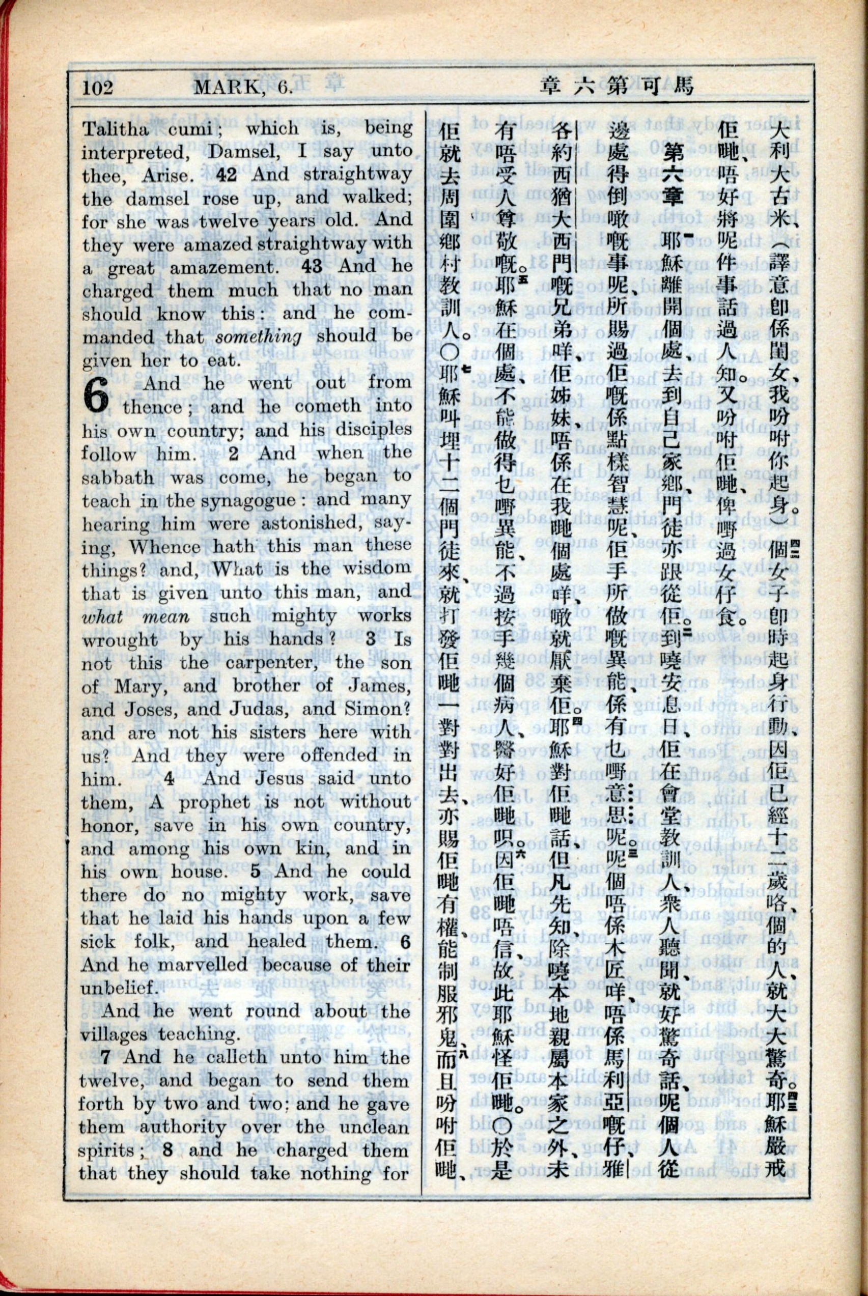 1931年新約全書廣東話新譯本與美國新譯英文 馬可福音 5 章 42 節到 6 章 8 節