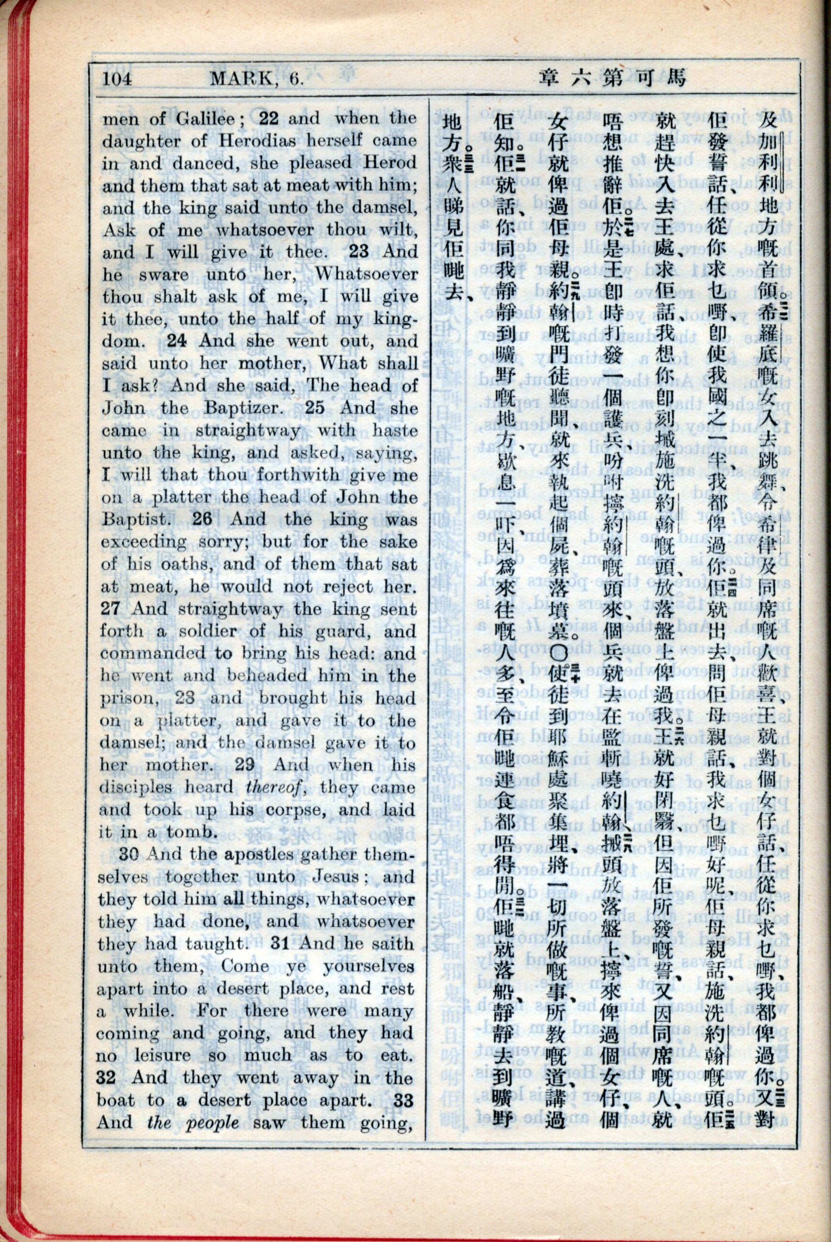 1931年新約全書廣東話新譯本與美國新譯英文 馬可福音 6 章 22 節到 6 章 32 節