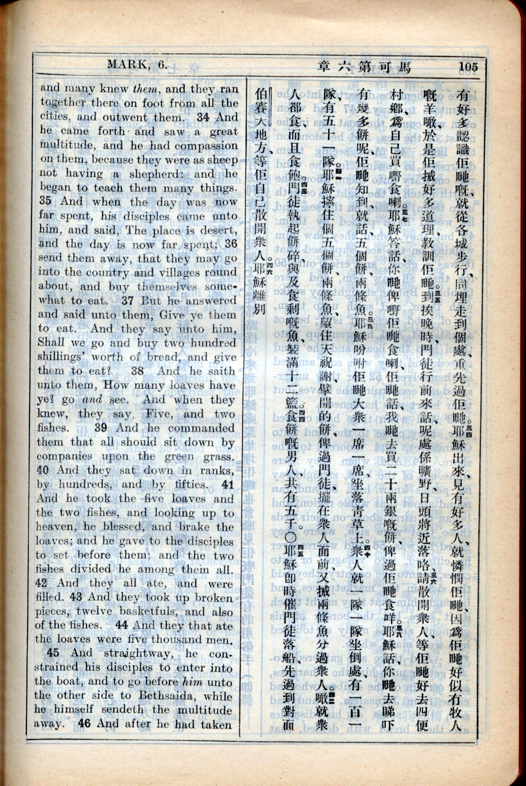 1931年新約全書廣東話新譯本與美國新譯英文 馬可福音 6 章 33 節到 6 章 45 節