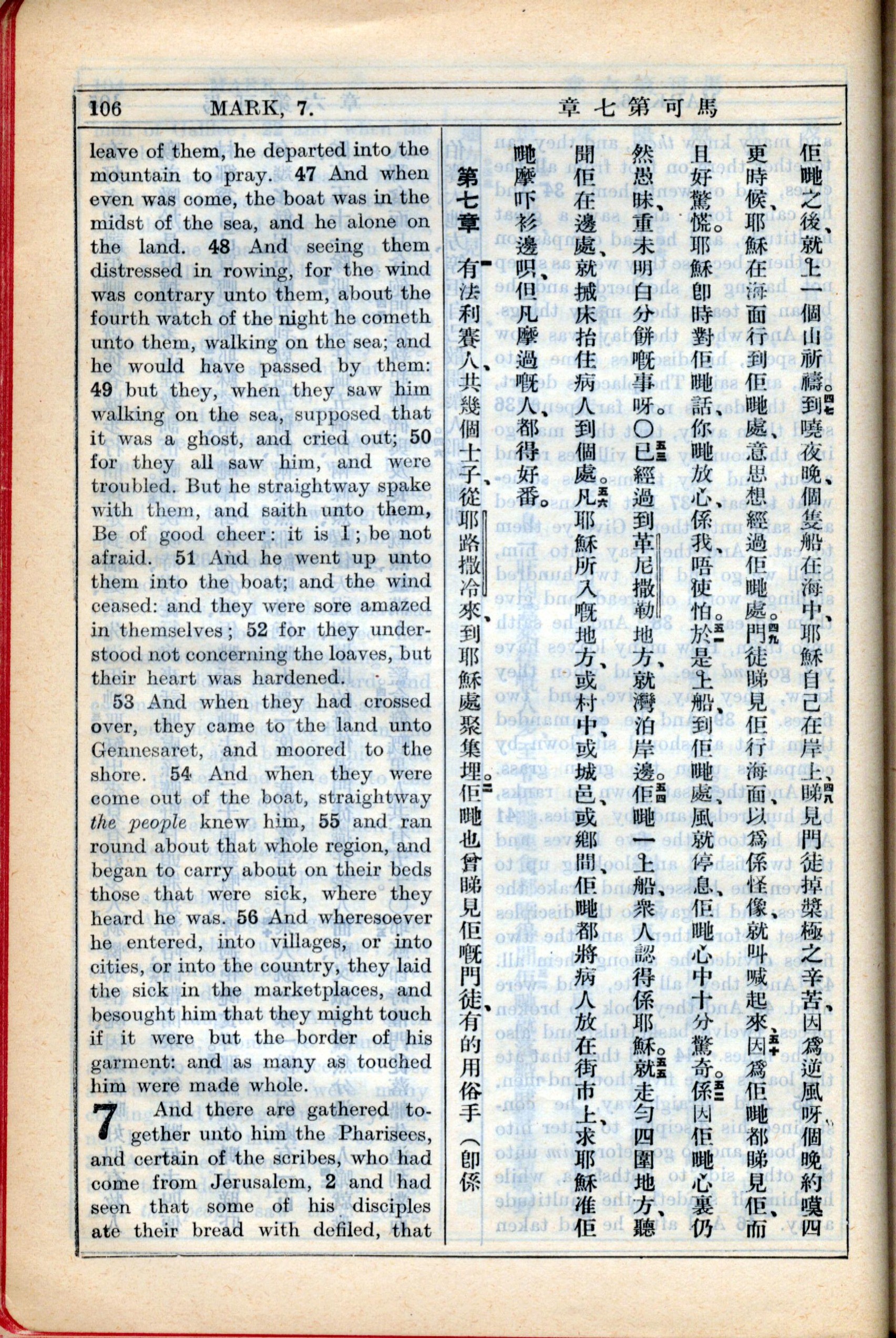 1931年新約全書廣東話新譯本與美國新譯英文 馬可福音 6 章 46 節到 7 章 2 節